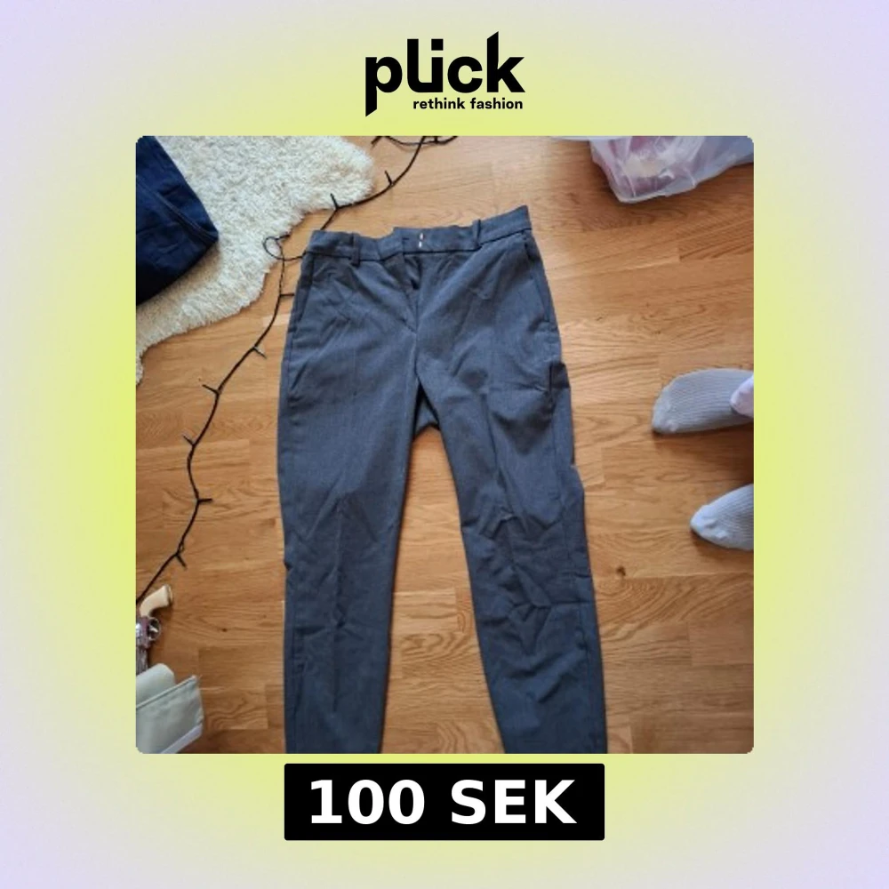Snygga grå kostymbyxor från H&M med en stilren design. Byxorna har en dragkedja och knappar i midjan för en säker passform. Perfekta för en elegant look.
