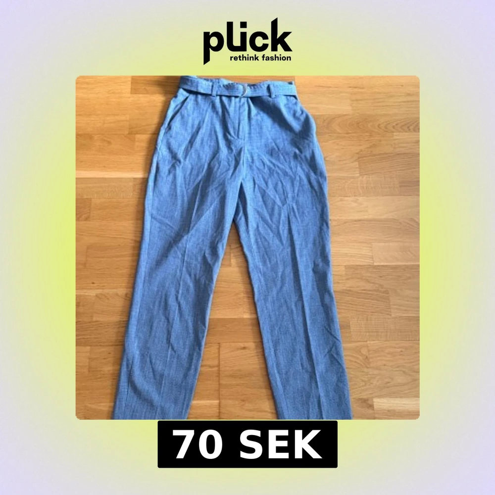 Snygga grå kostymbyxor med diskret rutigt mönster och tillhörande bälte med metallspänne. Byxorna har hög midja, raka ben och dragkedja framtill. Perfekta för en clean och stilren look. De ser blåa ut med tanke på ljuset men har bifogat (bild 2) hur de egentligen ser ut.