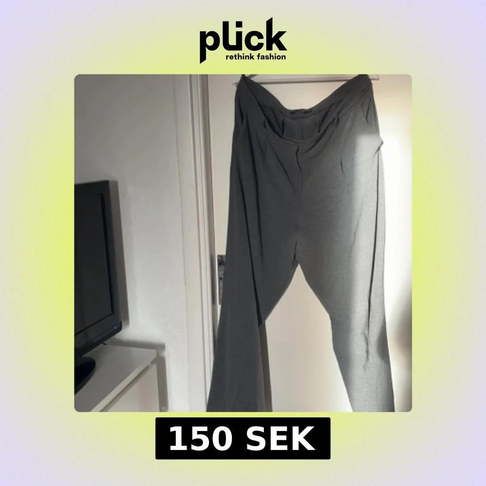 Snygga grå kostymbyxor med hög midja och vida ben. Byxorna har pressveck framtill och stängs med dragkedja och hake. Perfekta för en clean och stilren look.