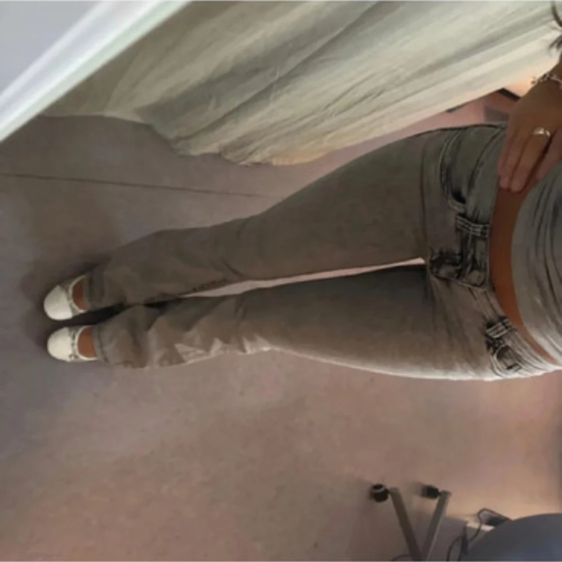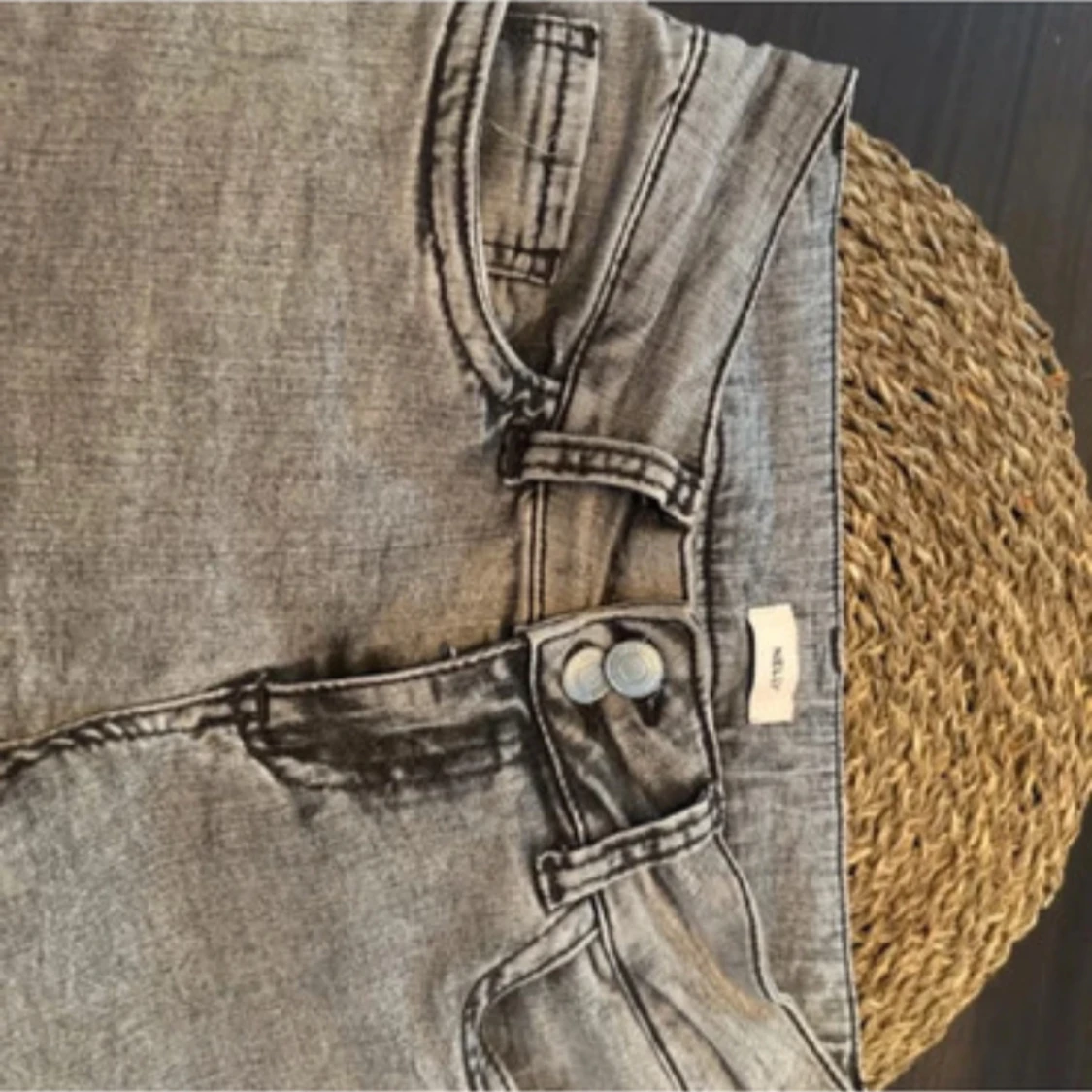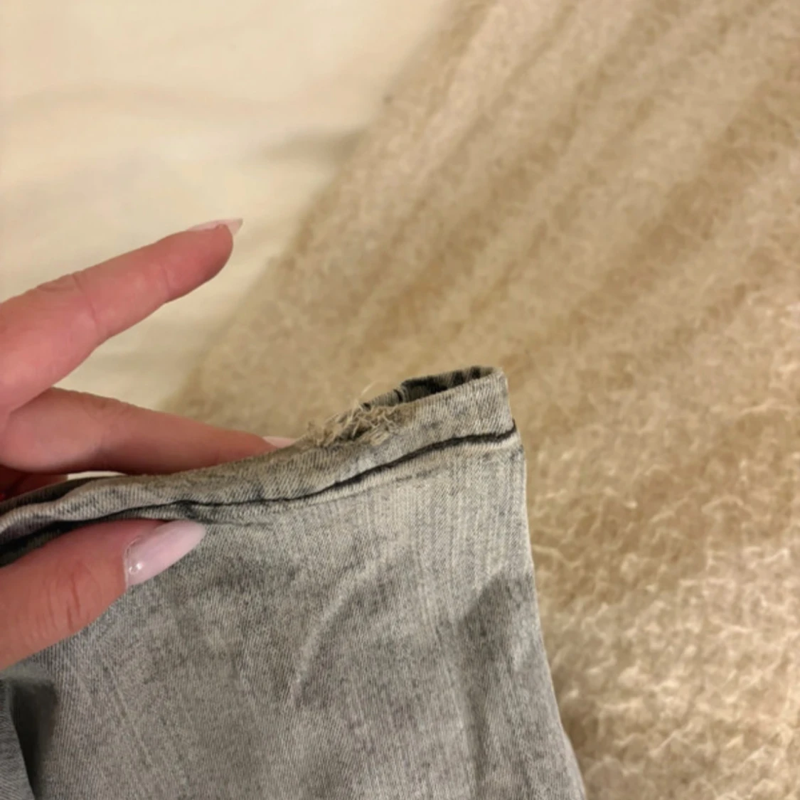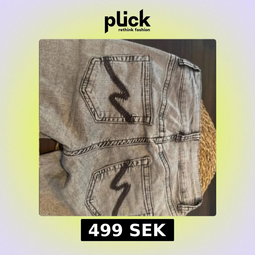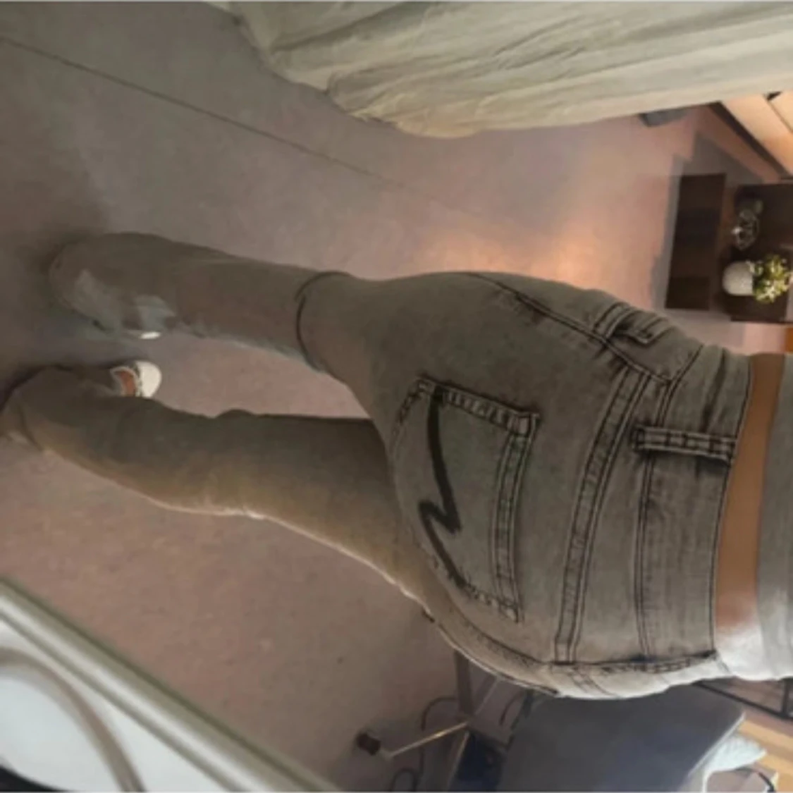 Snygga grå jeans från Nelly med lågmidja och cool svart zigzag-detalj på bakfickorna. Liten skada som syns på bild annars i nyskick, använda en gång! Flyttar så vill ha så snabb affär som möjligt