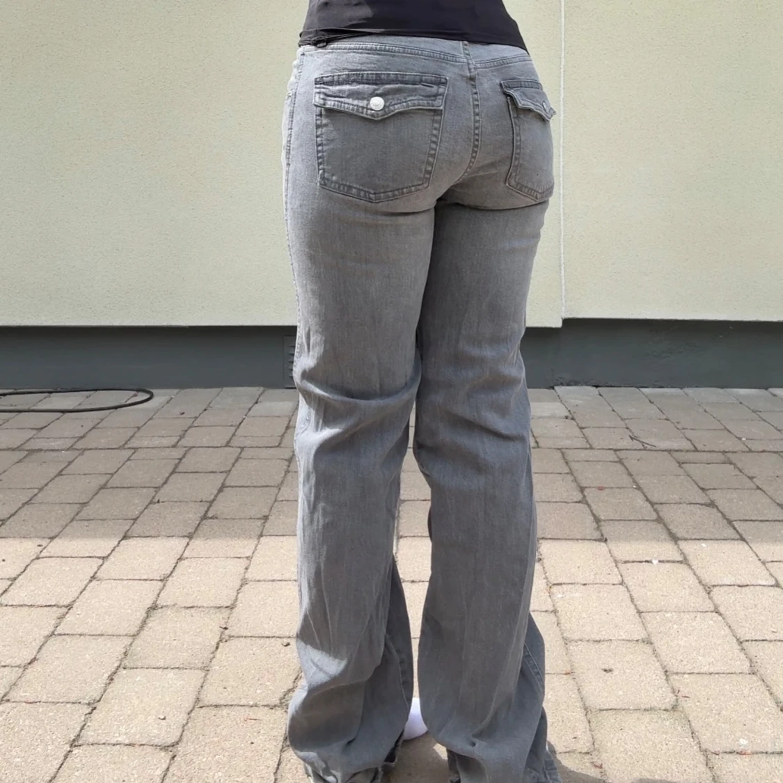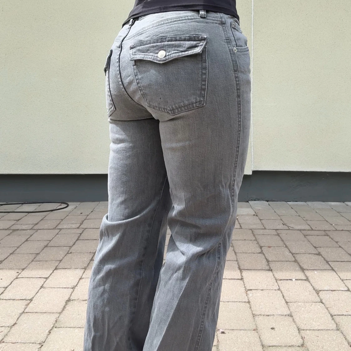 Säljer ett par grå lågmidjade jeansbyxor med utsvängda ben och klassiska fickor både fram och bak. Byxorna har normal passform och är i full längd. Perfekta för dig som gillar en enkel och stilren look.