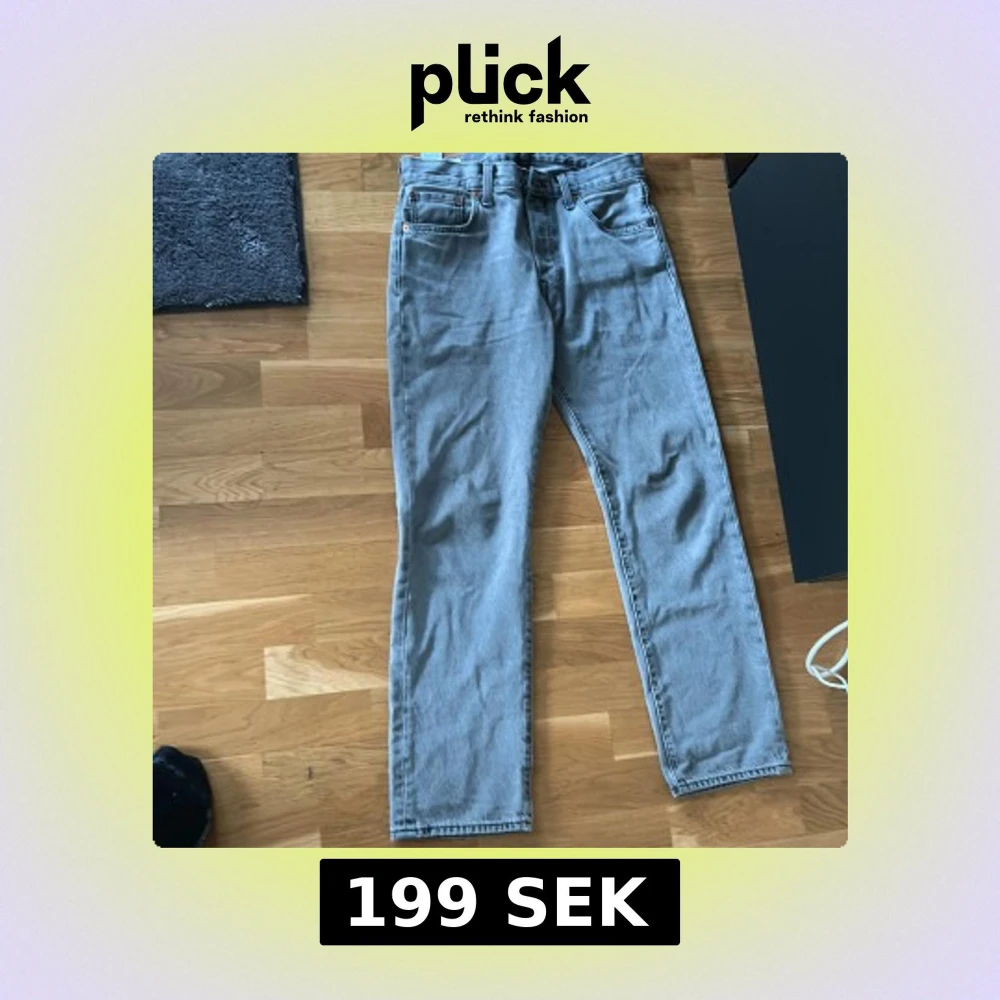 Snygga grå Levis 501 jeans med klassisk design. De har en rak passform och är tillverkade i slitstarkt denim. Byxorna har fem fickor och en knappgylf. Perfekta för en stilren look.
