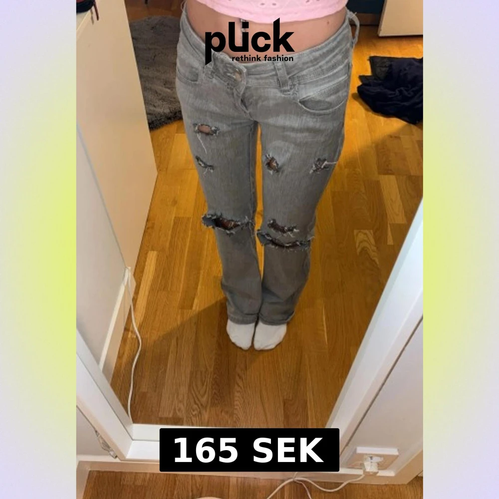 Säljer ett par gråa low waist jeans från Gina Tricot med snygga slitningar och hål på benen. Är 160cm lång. Justerbar midja