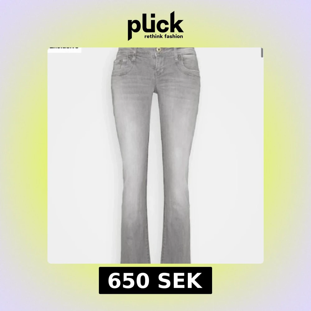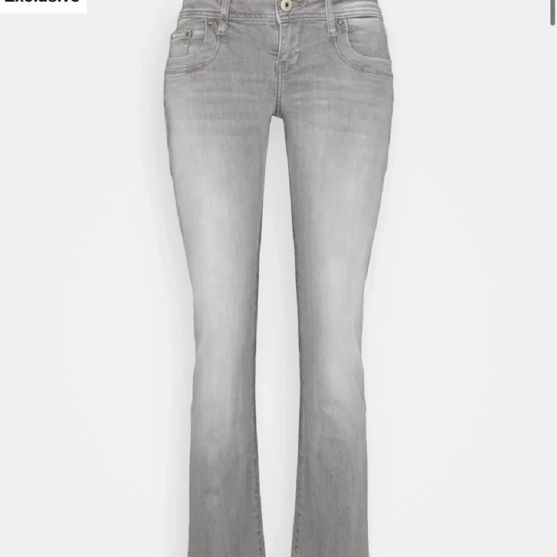 Snygga grå lågmidjade jeans med bootcut-modell och ljus tvätt. Klassisk femficksdesign och knappgylf. W27 L30 passar S/M.