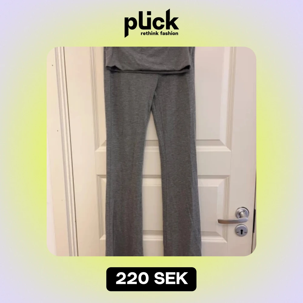 Två par grå yoga pants med låg midja och bootcut-stil. Ett par har en stjärna på rumpan. Byxorna är tillverkade i ett mjukt och bekvämt material, perfekt för avslappnade dagar.