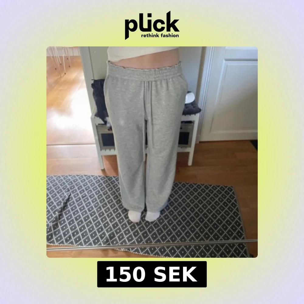 Säljer ett par grå mjukisbyxor med bred resår i midjan och raka, lösa ben. Byxorna är i mjukt bomullsmaterial och har en avslappnad passform.