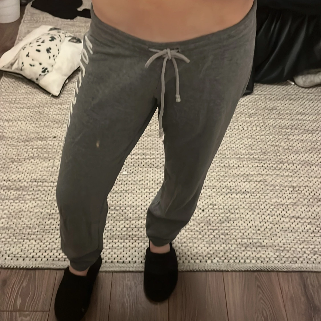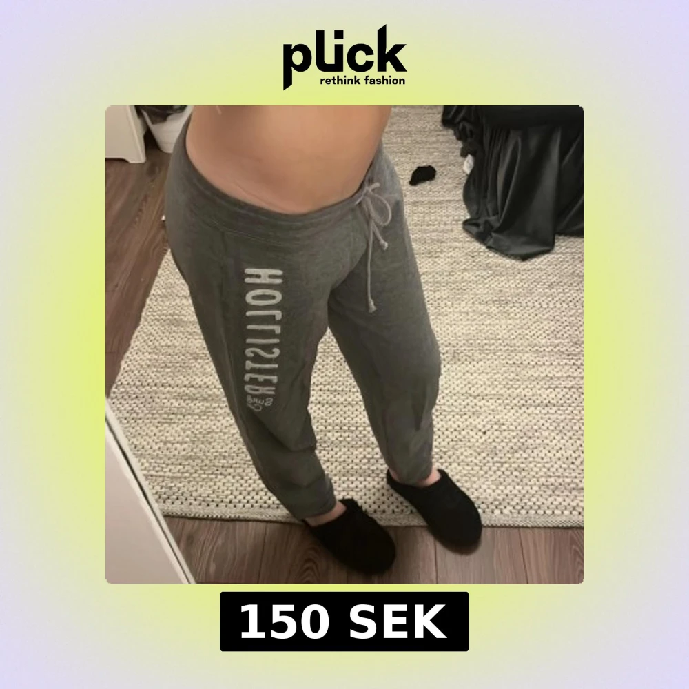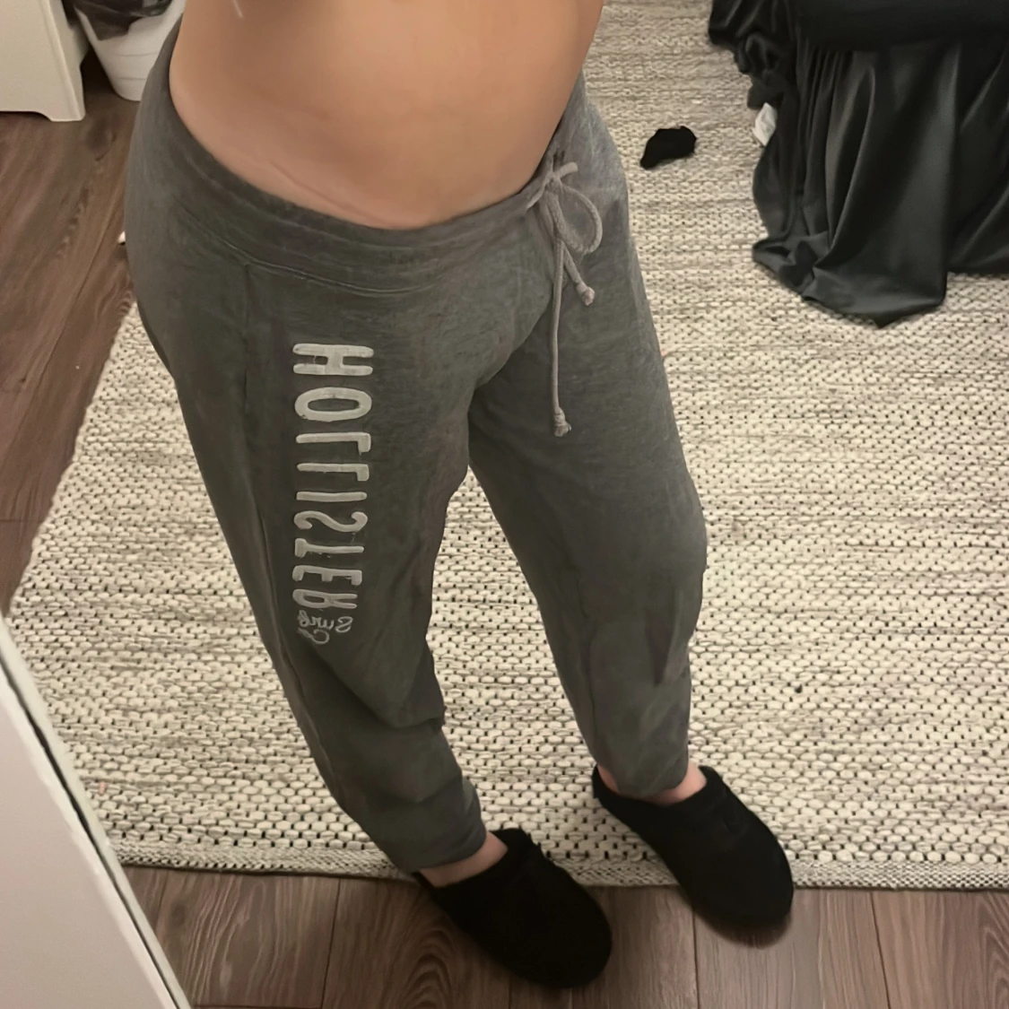 Grå mjukisbyxor från Hollister med vit logga längs benet. Byxorna har snörning i midjan och är tillverkade i mjukt bomullsmaterial. Perfekta för chill dagar och har en avslappnad passform.