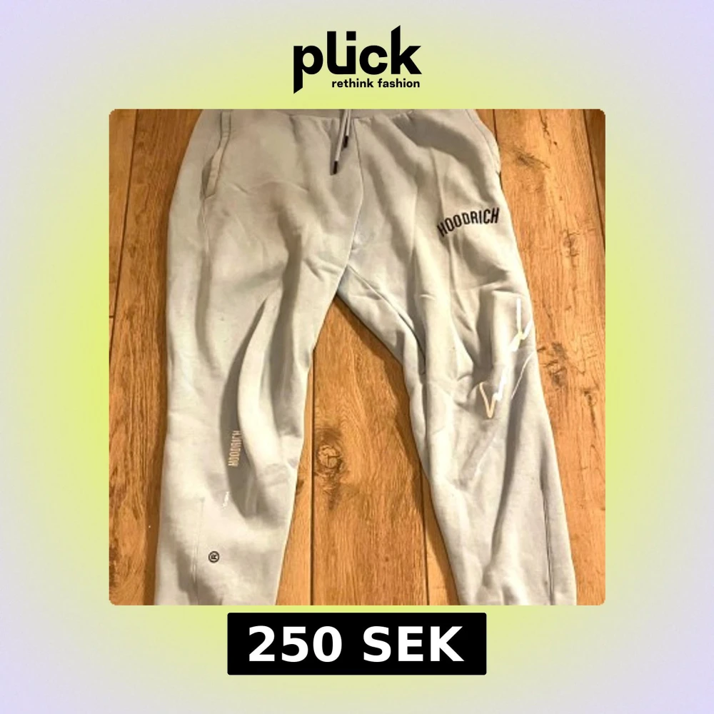 Säljer ett par grå mjukisbyxor från Hoodrich med elastisk midja och dragsko. Byxorna har tryckt logotyp på benet och är perfekta för en avslappnad stil. De har en bekväm passform och är gjorda i mjukt material.