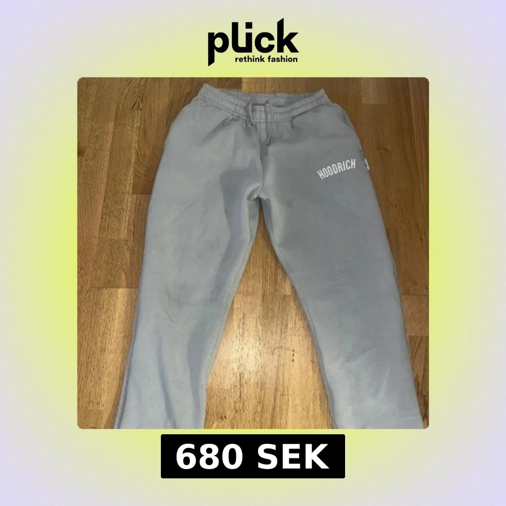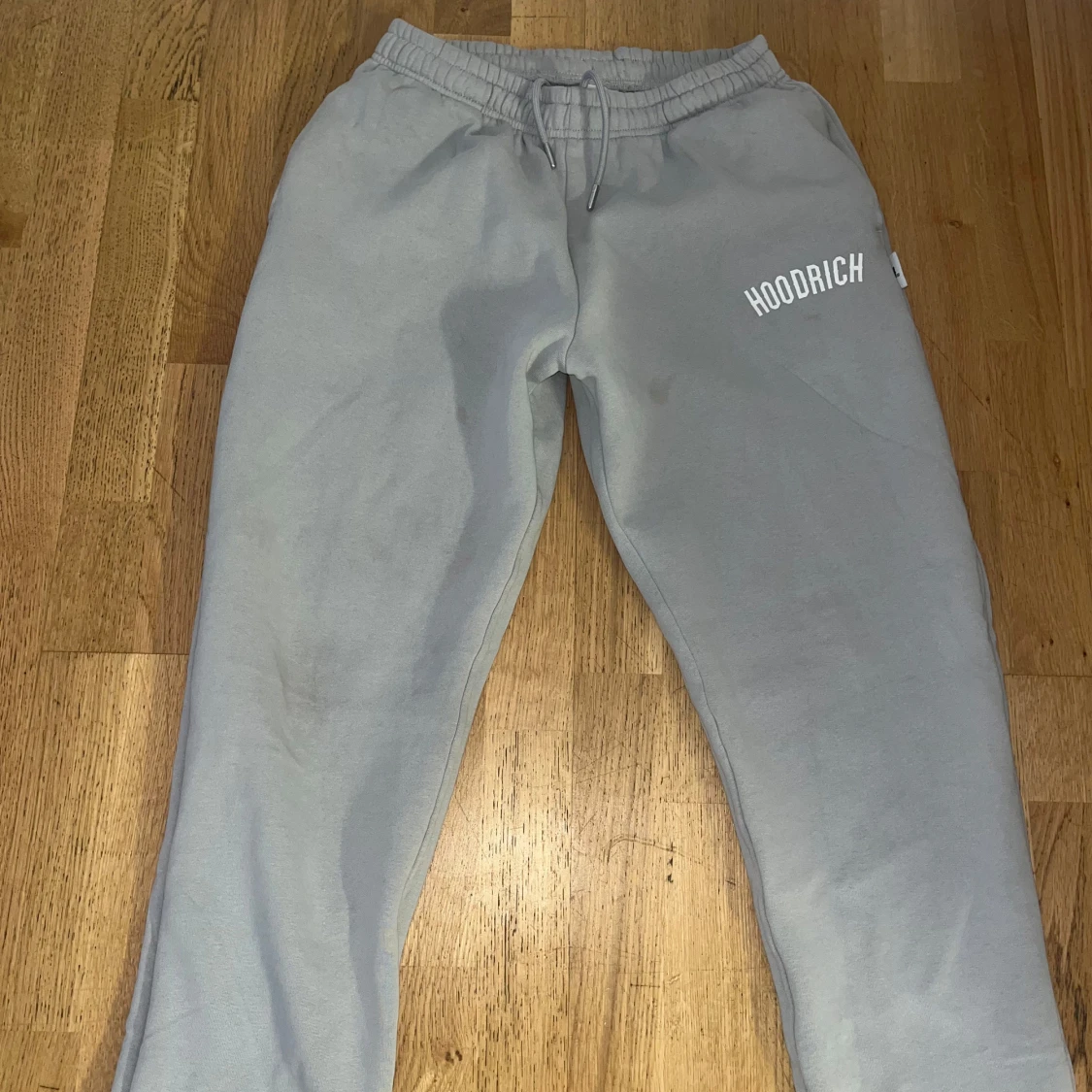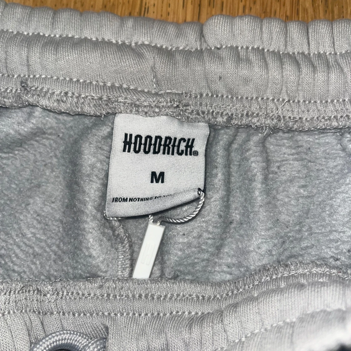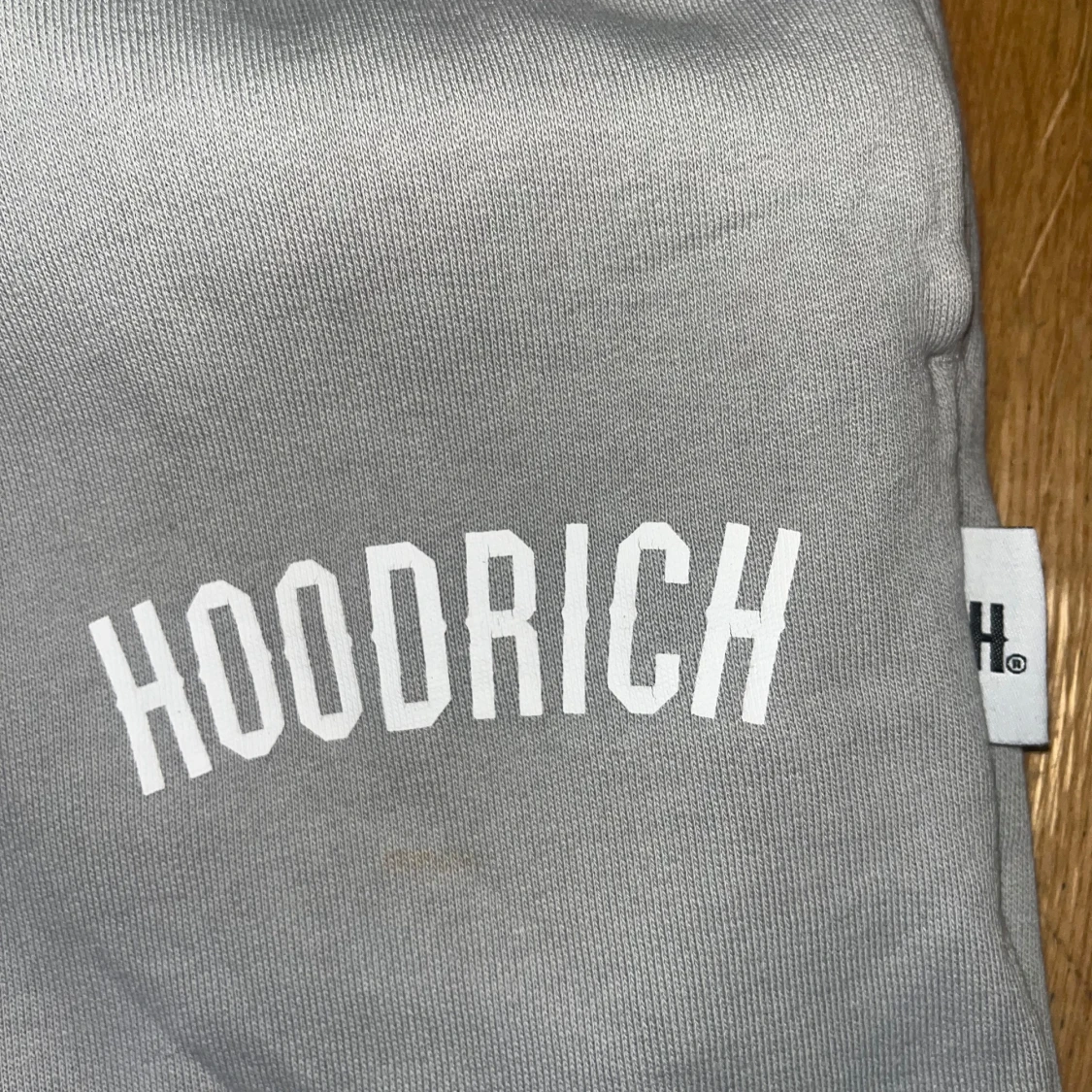 Grå mjukisbyxor från Hoodrich i storlek M. Byxorna har elastisk midja med snörning och tryckt Hoodrich-logga på vänster ben. Tillverkade i mjukt bomullsmaterial för maximal komfort och avslappnad stil.
