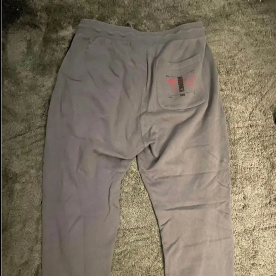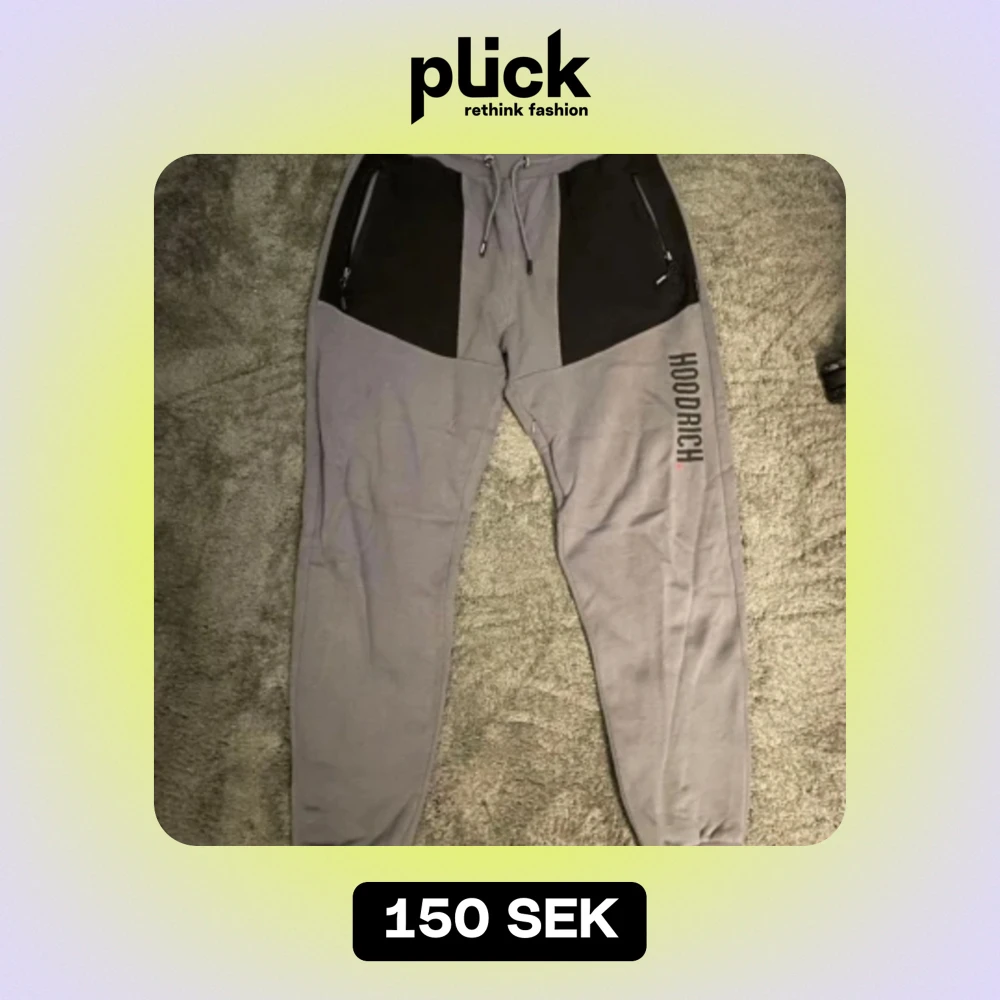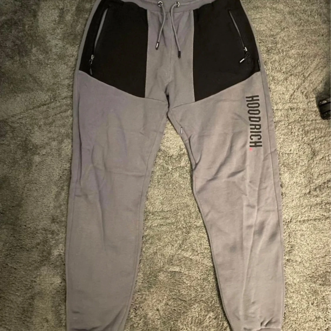 Ett par grå mjukisbyxor från Hoodrich med svarta detaljer. Byxorna har en elastisk midja med snörning och dragkedjefickor framtill. På vänster ben finns en tryckt logotyp i svart och rött.