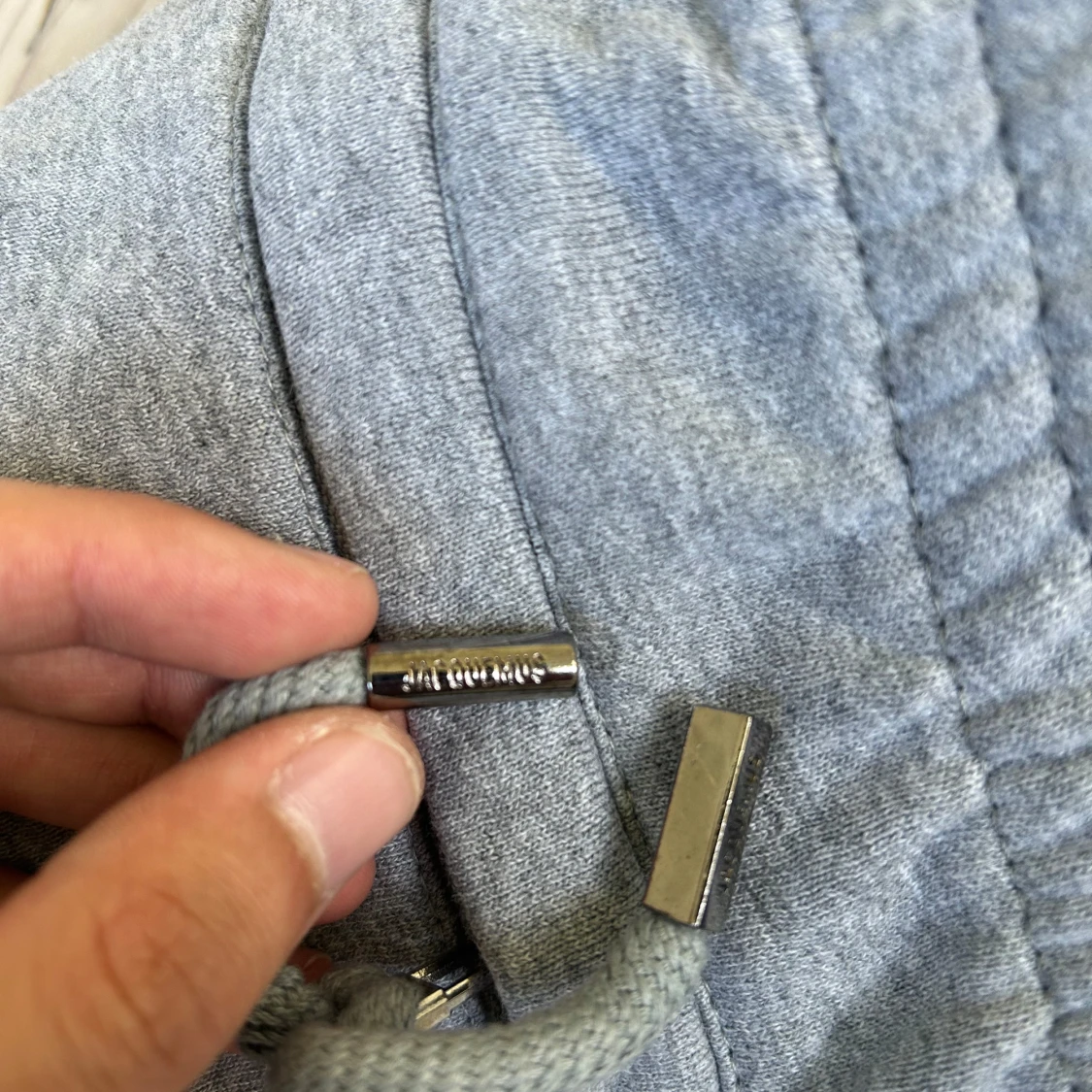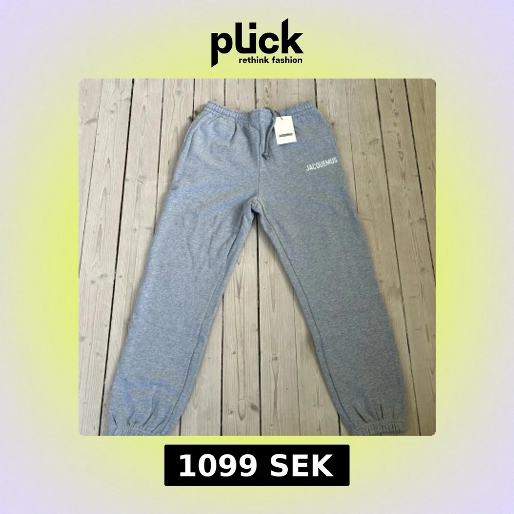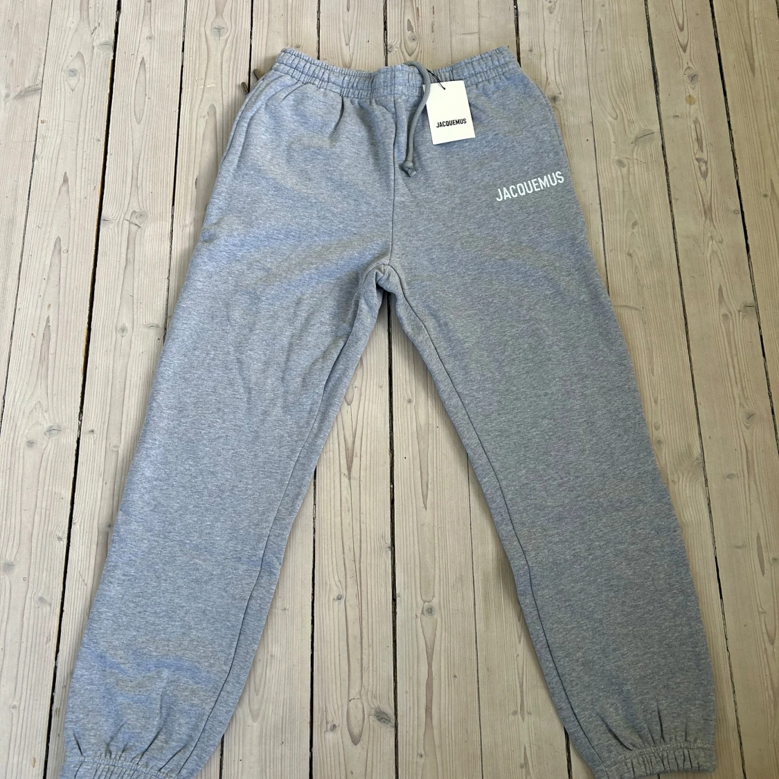 Snygga grå mjukisbyxor från Jacquemus med vit logga på ena benet. Byxorna har resår i midjan, dragsko och muddar vid bensluten. Perfekta för en avslappnad stil och riktigt sköna att ha på sig.