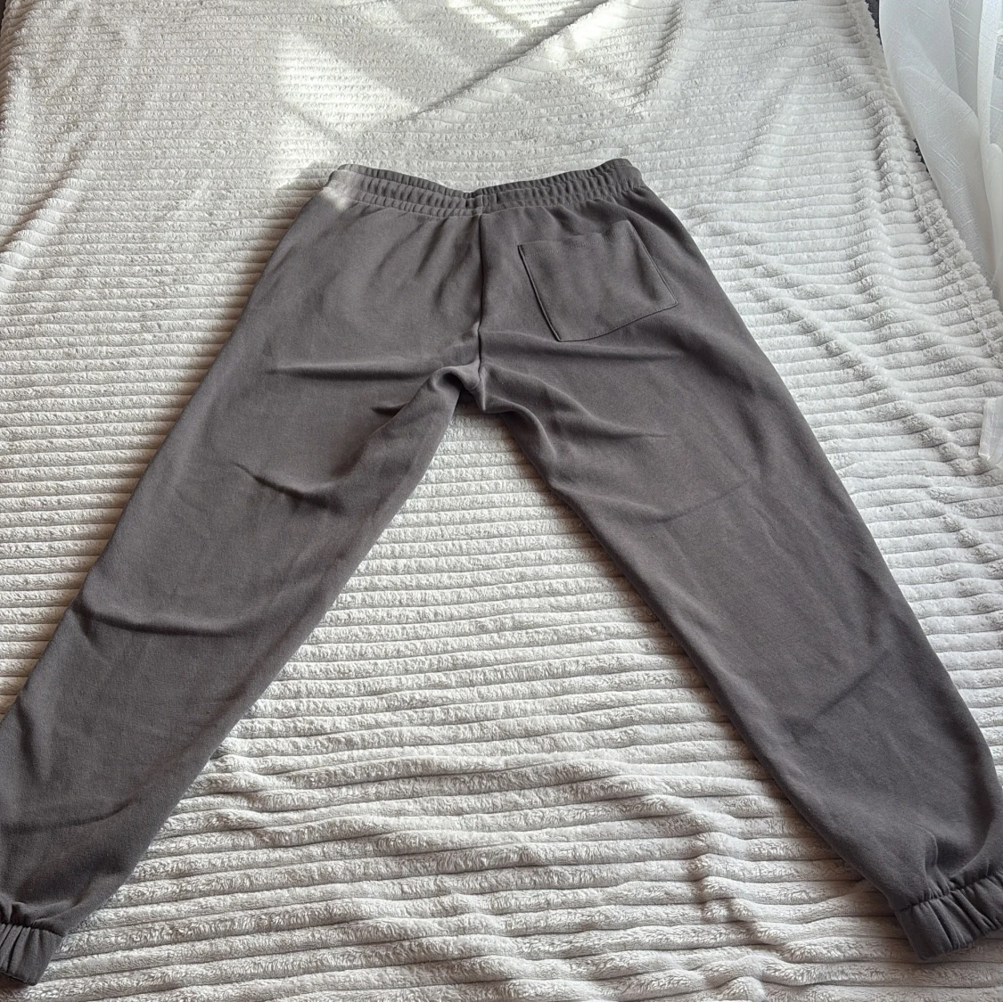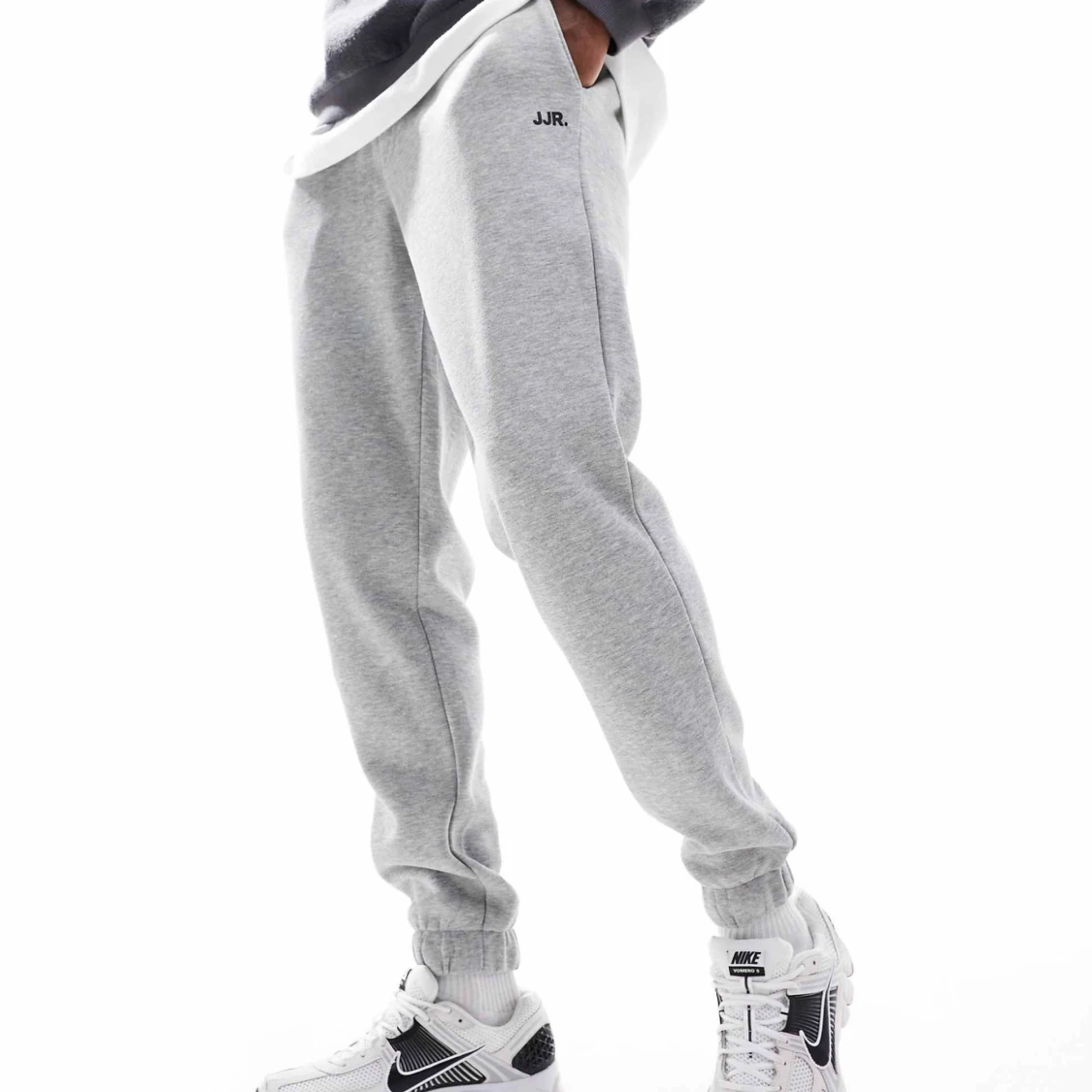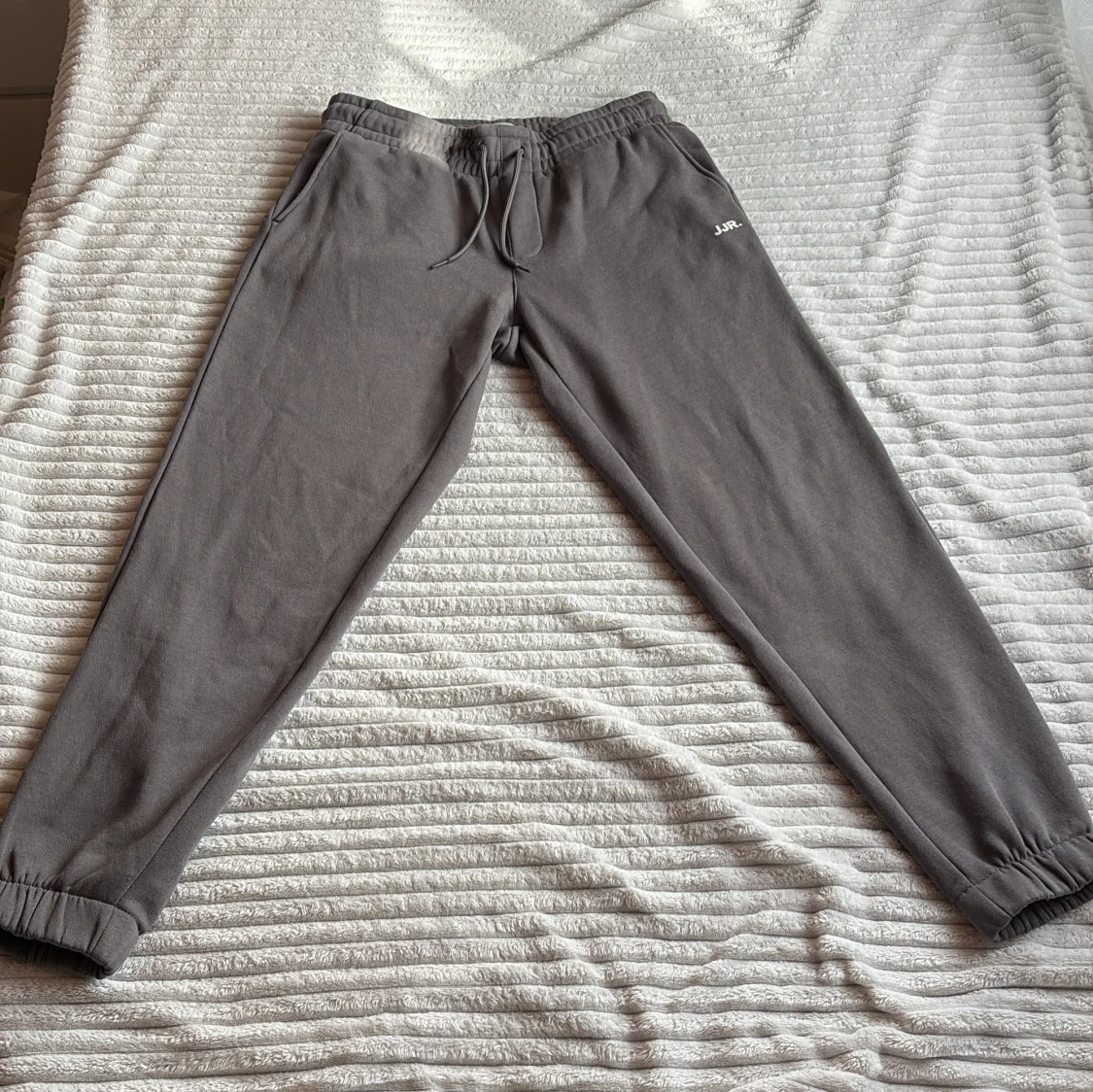 Säljer ett par grå mjukisbyxor från JJREBEL med resår i midjan och benslut, samt snörning i midjan. Byxorna har sidofickor och en bakficka, perfekt för en avslappnad stil.