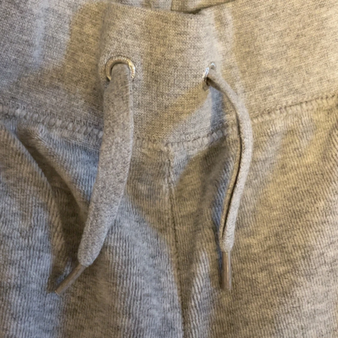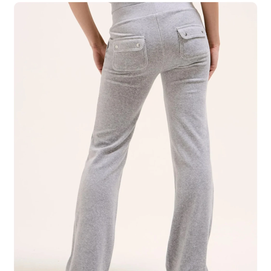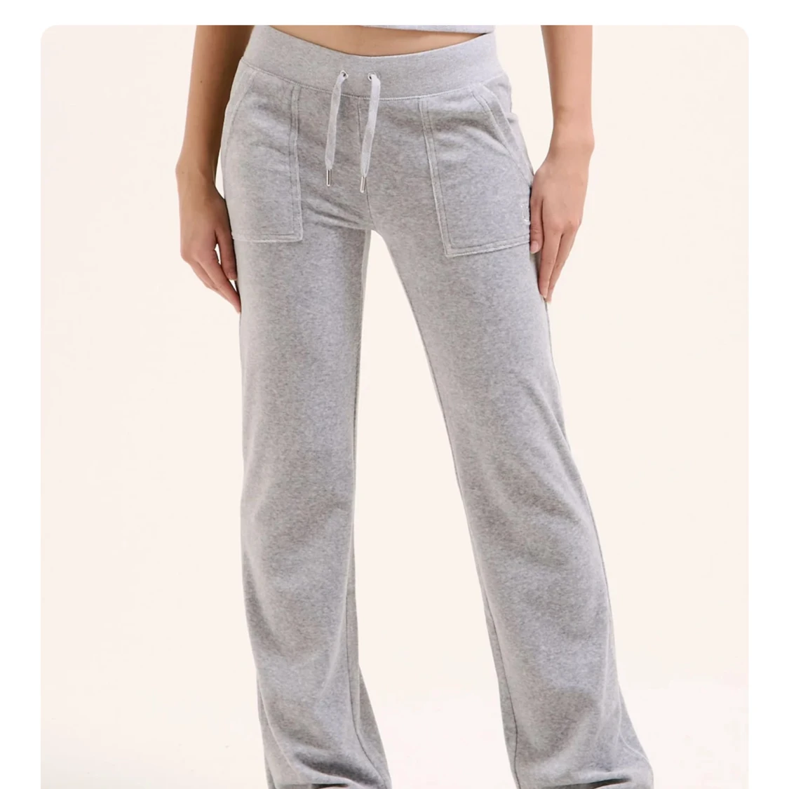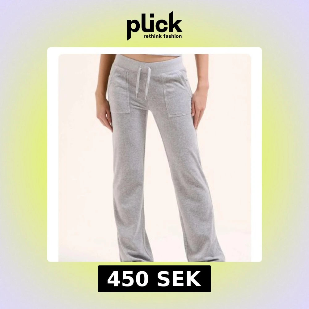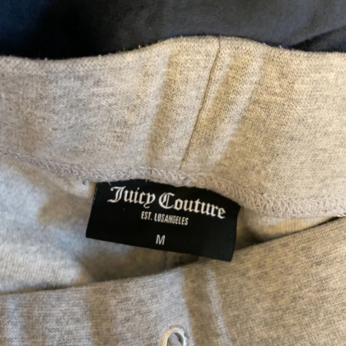 Säljer ett par grå mjukisbyxor från Juicy Couture i storlek M, dock känns de lite mer som S/M. Byxorna har raka ben, stora fickor fram och bakfickor med knapp. Har använts cirka 2 gånger och är som helt nya. Det enda är att på snörerna har de metall grejerna lossnat, som man ser på sista bilden. Orginalpris: 1200kr.