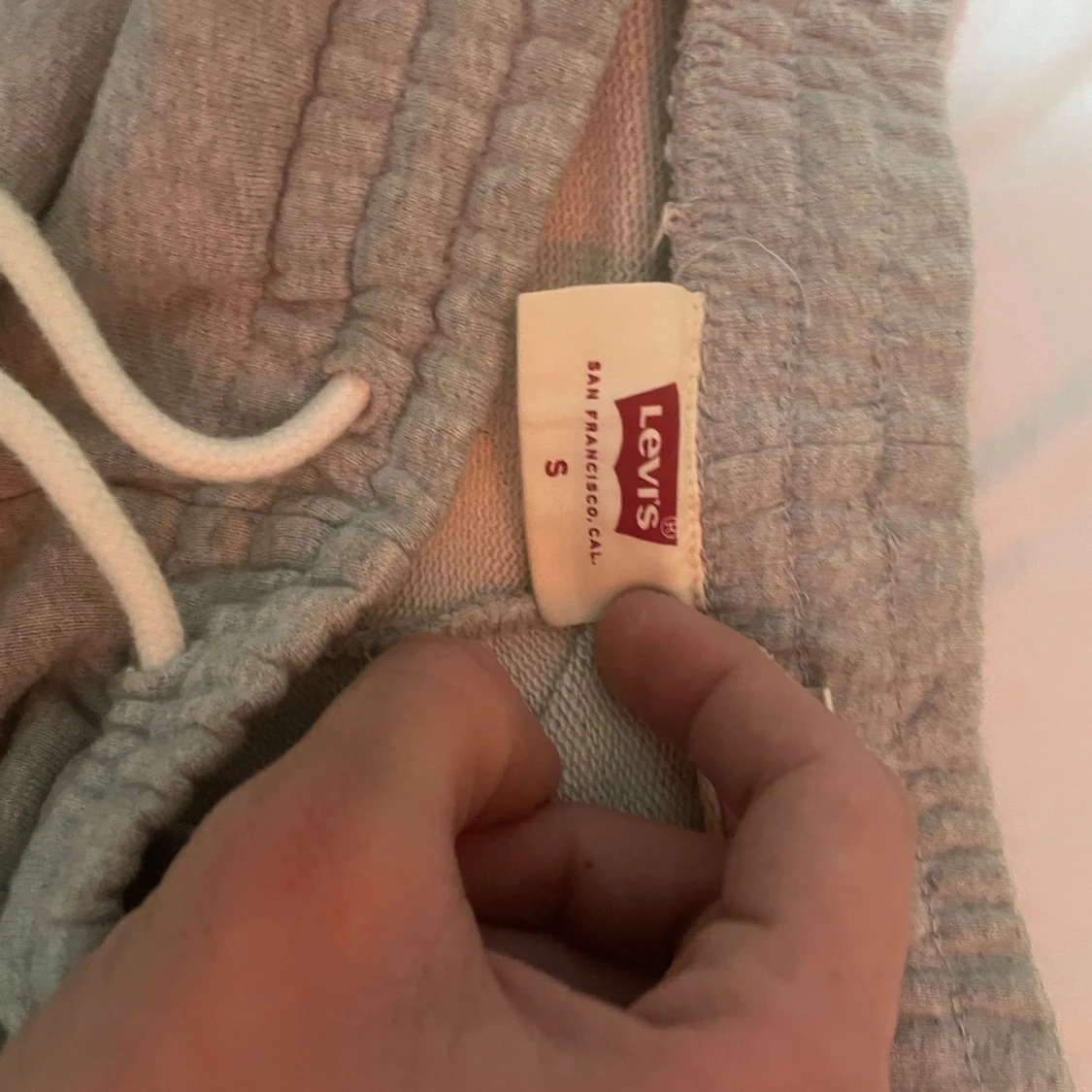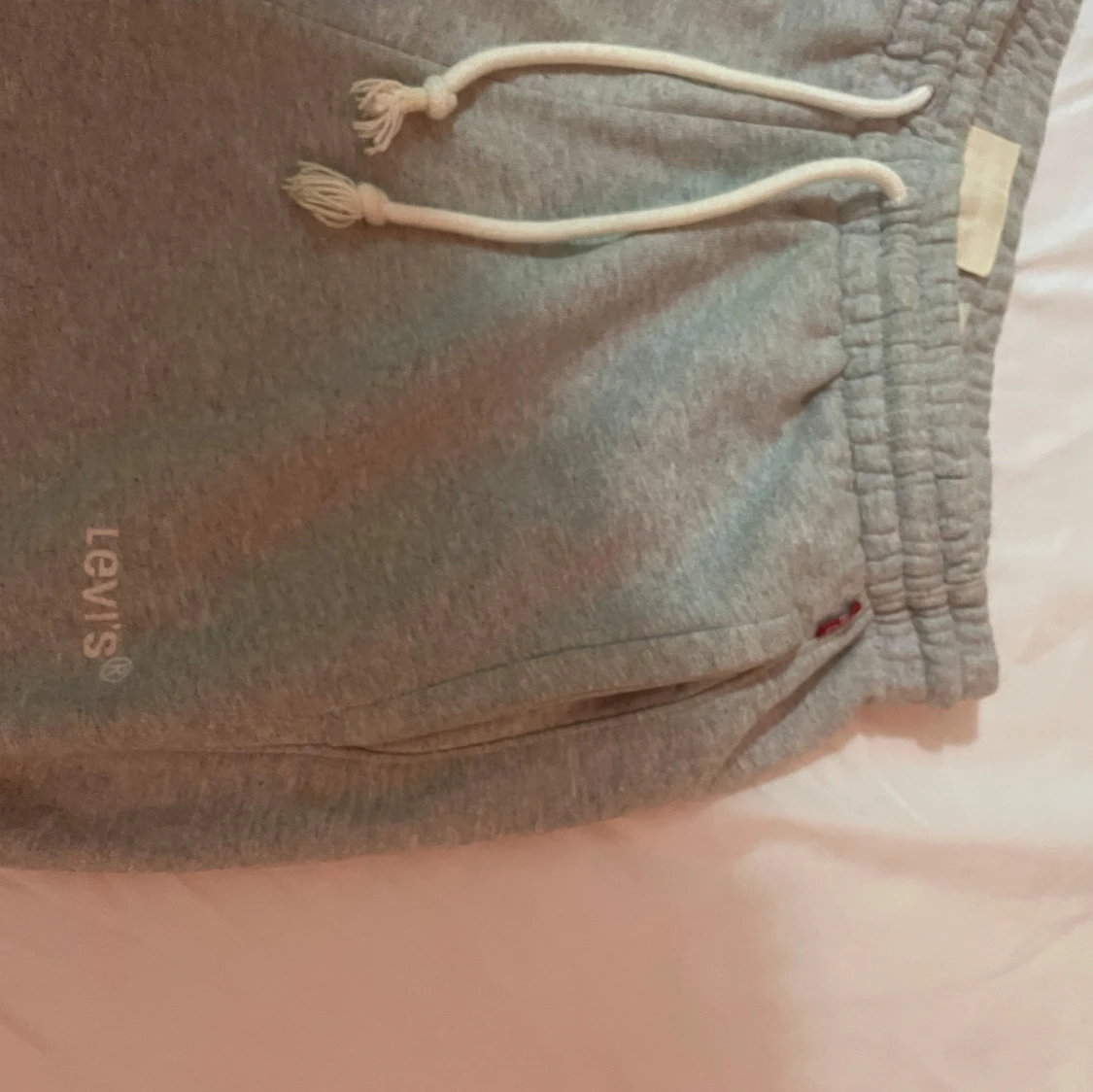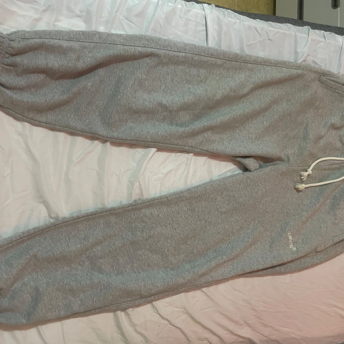 Säljer ett par grå mjukisbyxor från Levi's med snörning i midjan och elastiska muddar vid bensluten. Perfekta för en avslappnad stil. Byxorna har en diskret Levi's-logga på sidan.