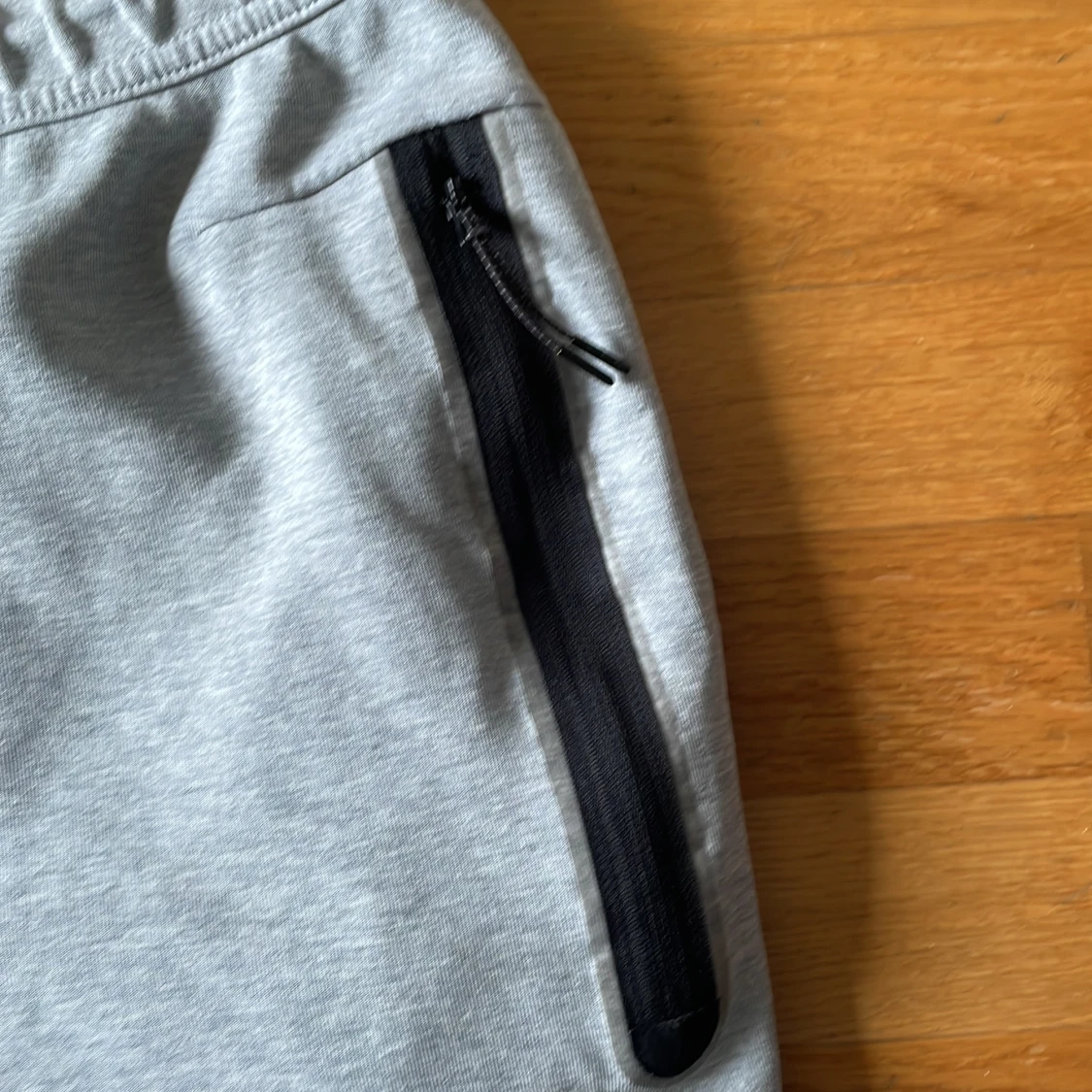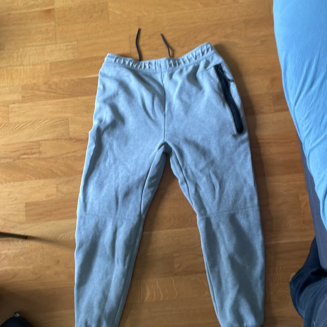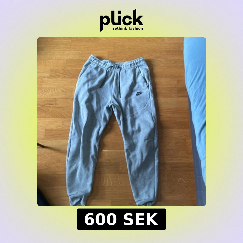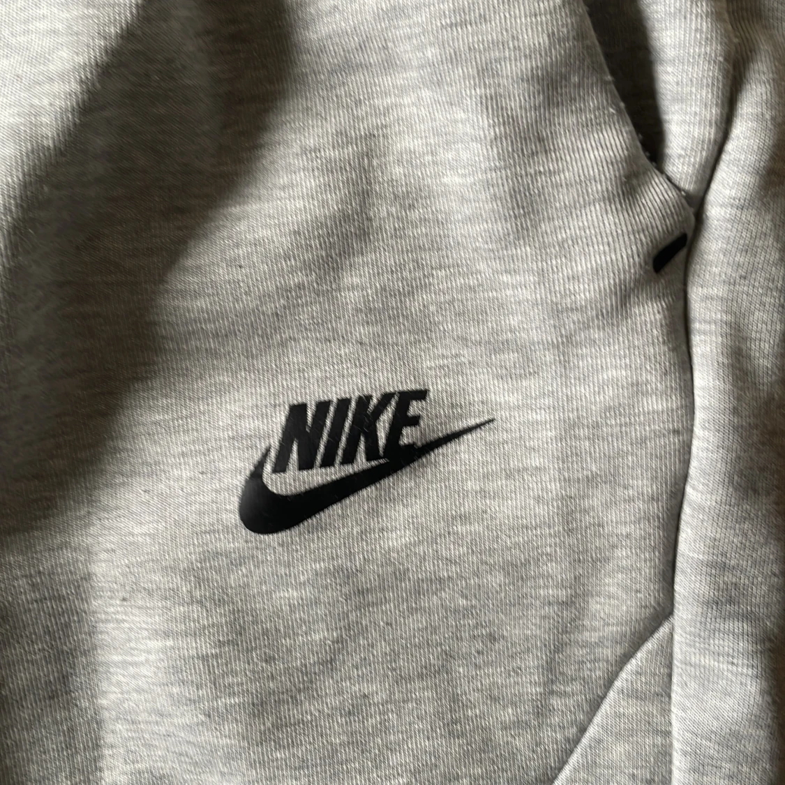 Grå mjukisbyxor från Nike med svart logga på låret och svarta snören i midjan. Byxorna har elastisk midja, ribbade muddar vid bensluten och praktiska fickor med dragkedja. Perfekta för chill eller träning.
