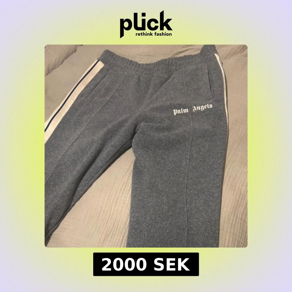 Snygga grå mjukisbyxor från Palm Angels med vit logga på sidan. Byxorna har en elastisk midja och vita ränder längs sidorna. Köpa för 4000 men säljer för 2000