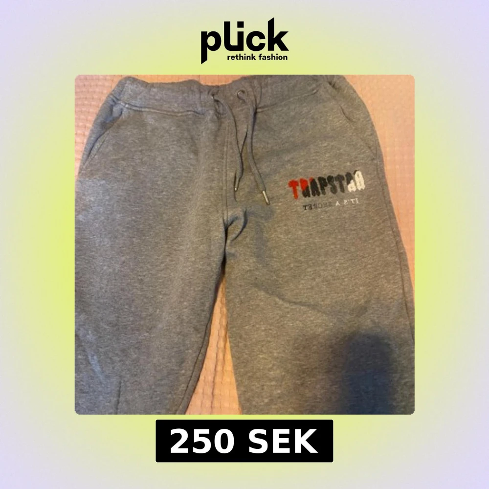 Grå mjukisbyxor från Trapstar med broderad logga i rött, svart och vitt på ena benet. Byxorna har snörning i midjan, sidofickor och dragkedja vid benslut. Insidan är mjuk och fleecefodrad för extra komfort.