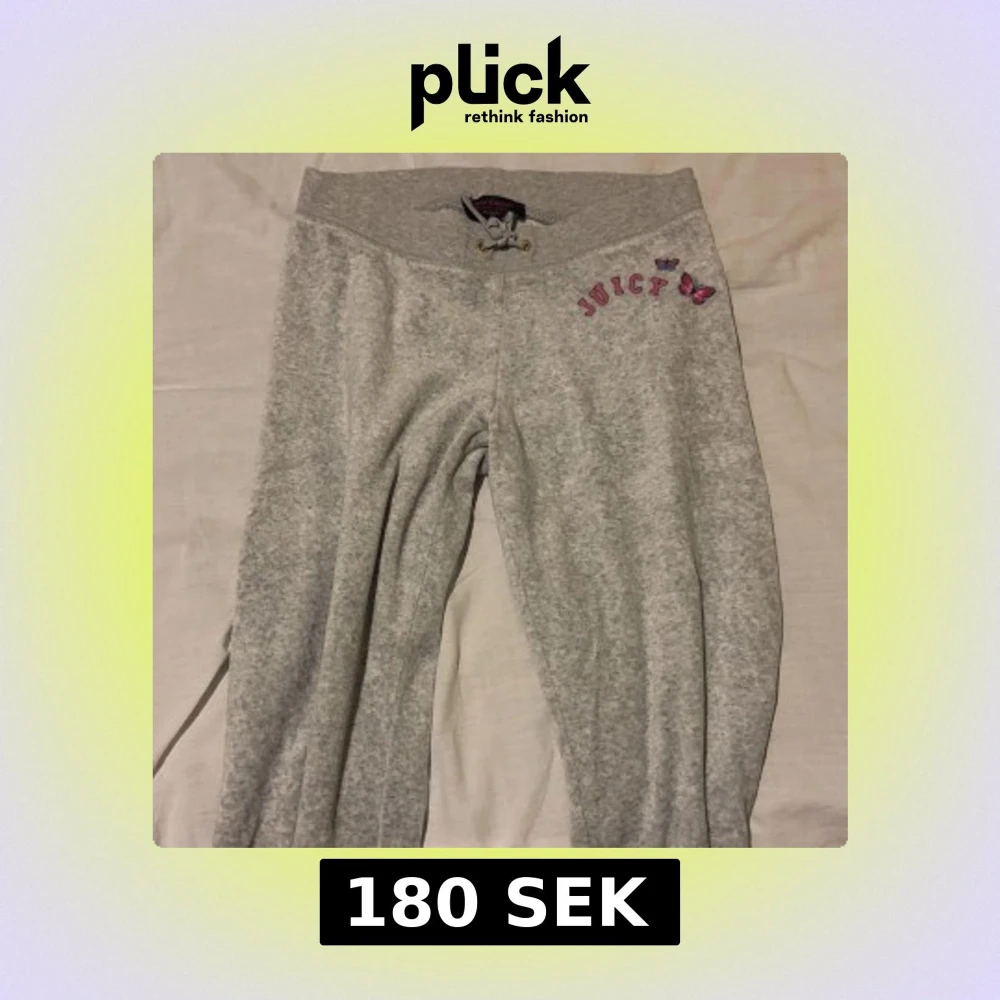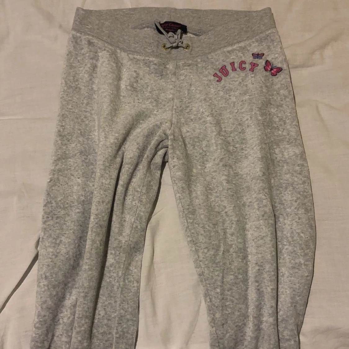 Säljer ett par grå mjukisbyxor från Juicy Couture med snörning i midjan och rosa JUICY-text samt fjärilar broderade vid höften. Byxorna har en loose passform och är perfekta för chill dagar. Supermjukt material som känns skönt mot huden.