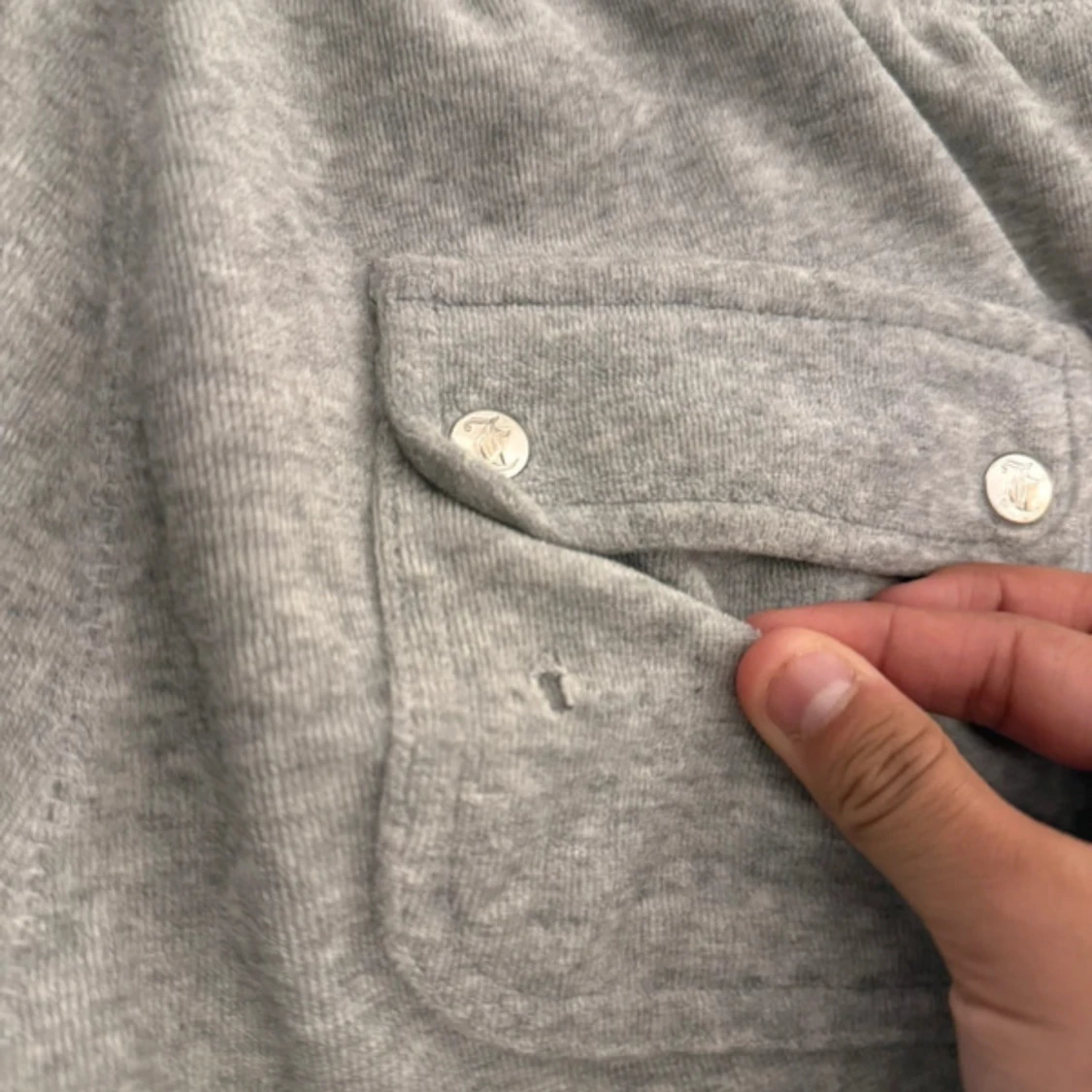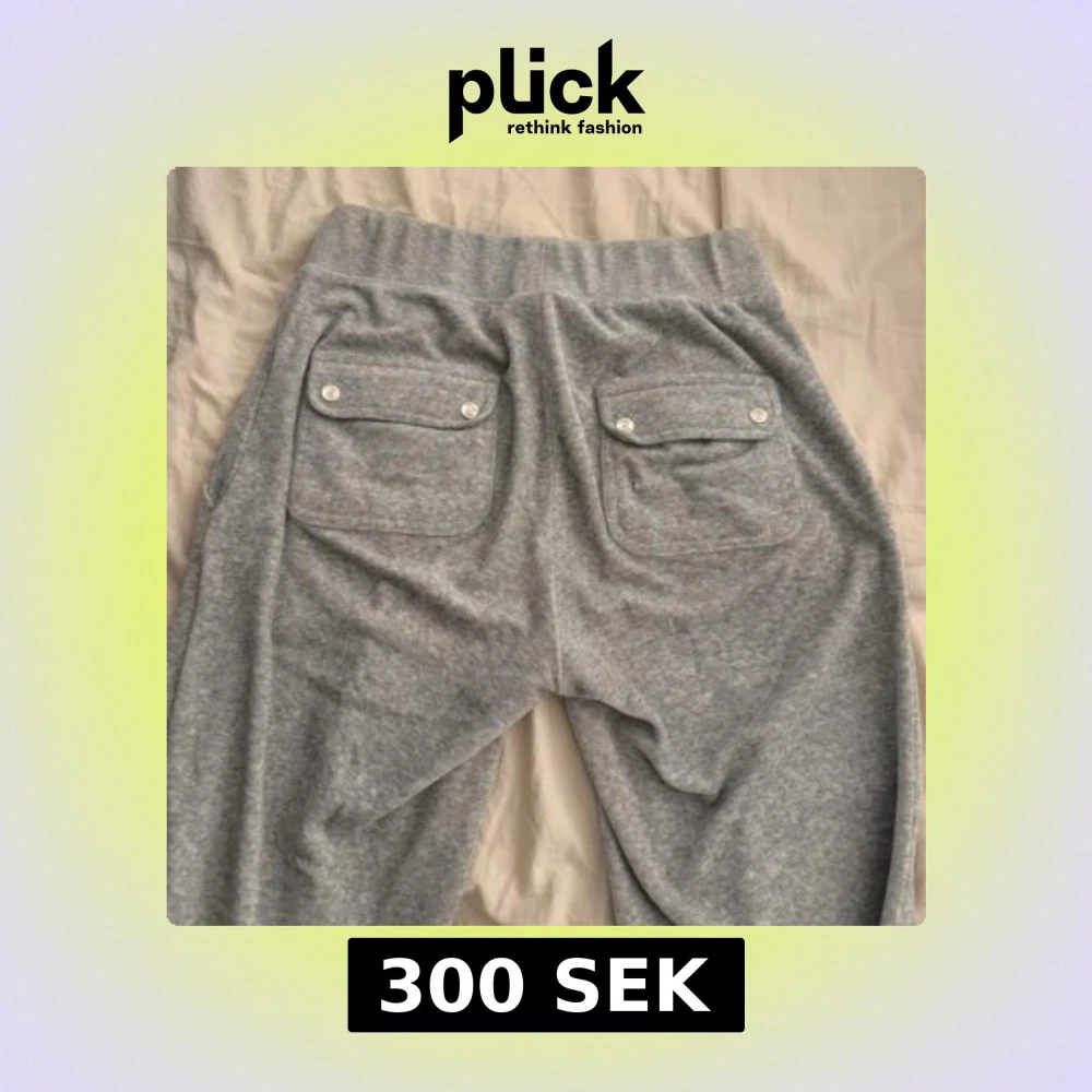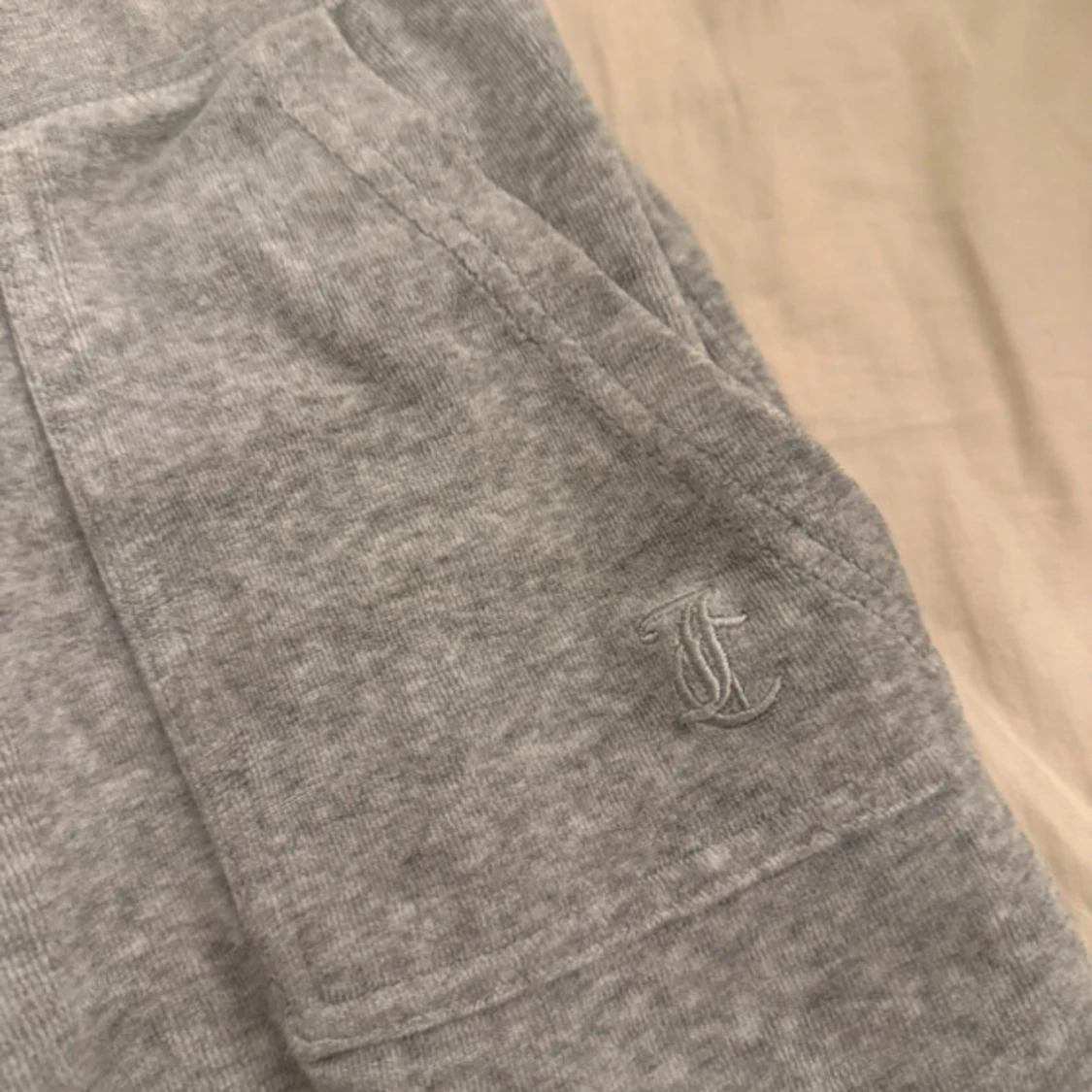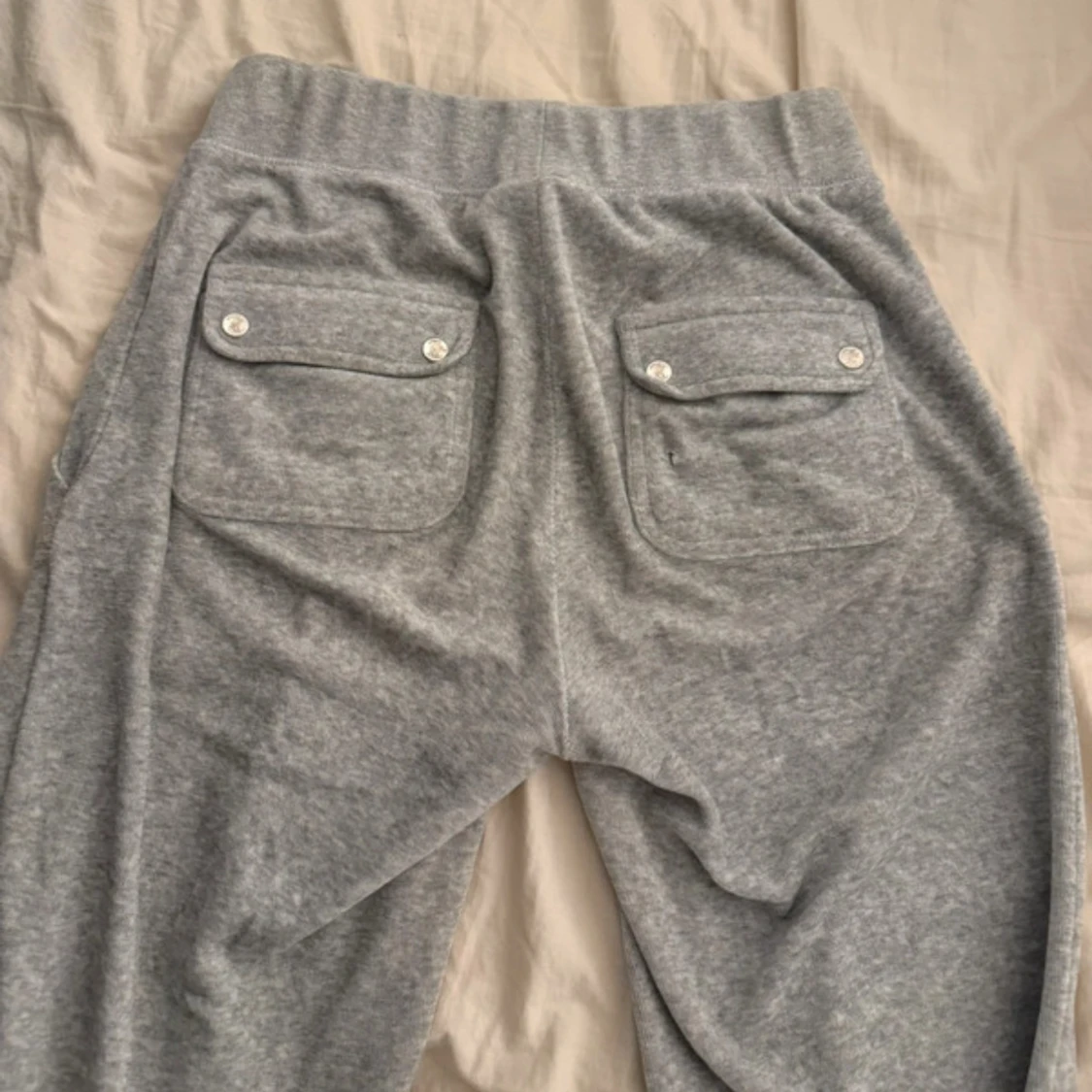 Grå mjukisbyxor från Juicy Couture med broderad JC-logga på fickan. Byxorna har bred resår i midjan, snörning och två bakfickor med lock och silvriga knappar. Mjukt bomullsmaterial som är perfekt för chill dagar.