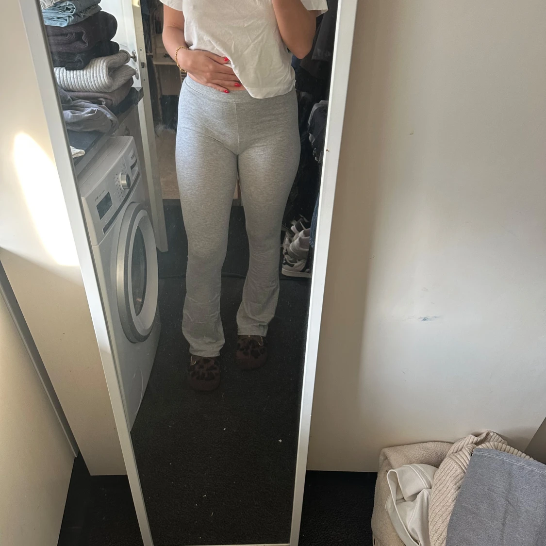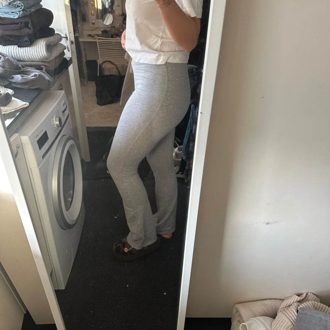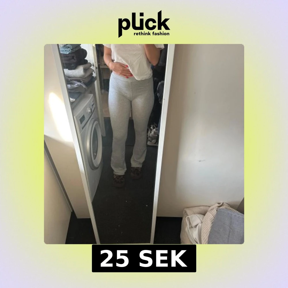 Säljer ett par ljusgrå mjukisbyxor med hög midja. Byxorna är tighta och har en enkel, klassisk design utan synliga detaljer. Perfekta för en avslappnad stil.
