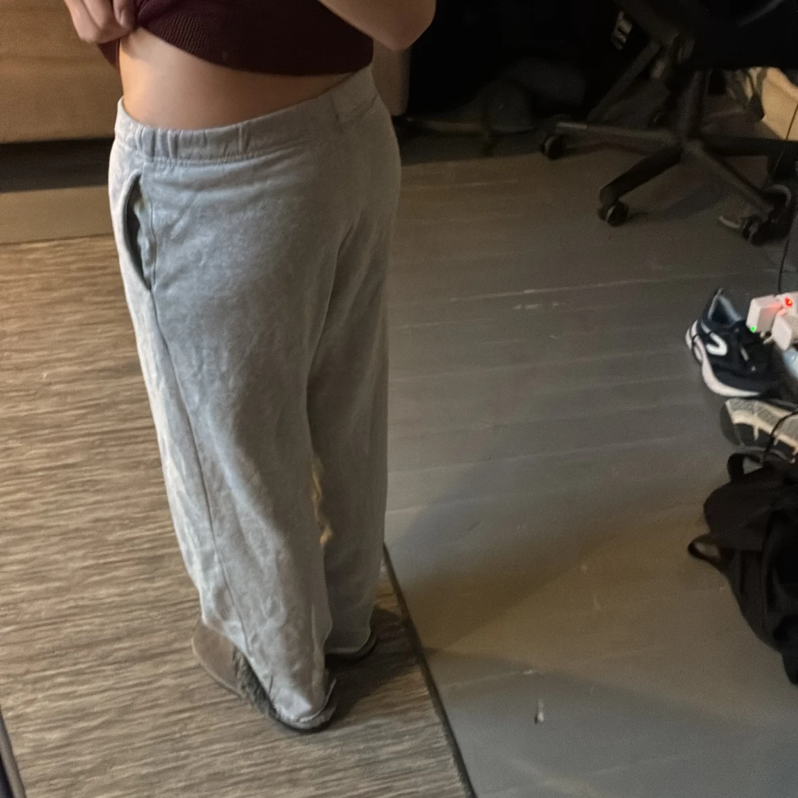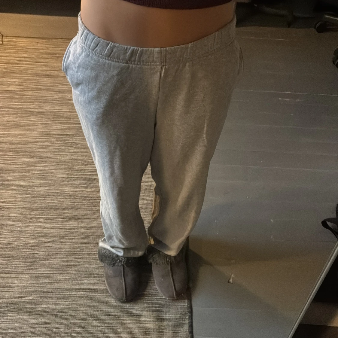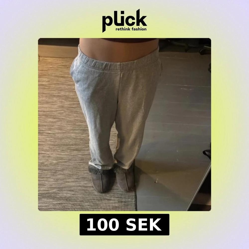 Säljer ett par grå mjukisbyxor med resår i midjan och raka ben. Byxorna har en avslappnad passform och sidofickor, perfekta för chill dagar hemma eller när du vill vara bekväm. Materialet är mjukt och skönt mot huden. Orginelt resor i botten, men har klippt av de.