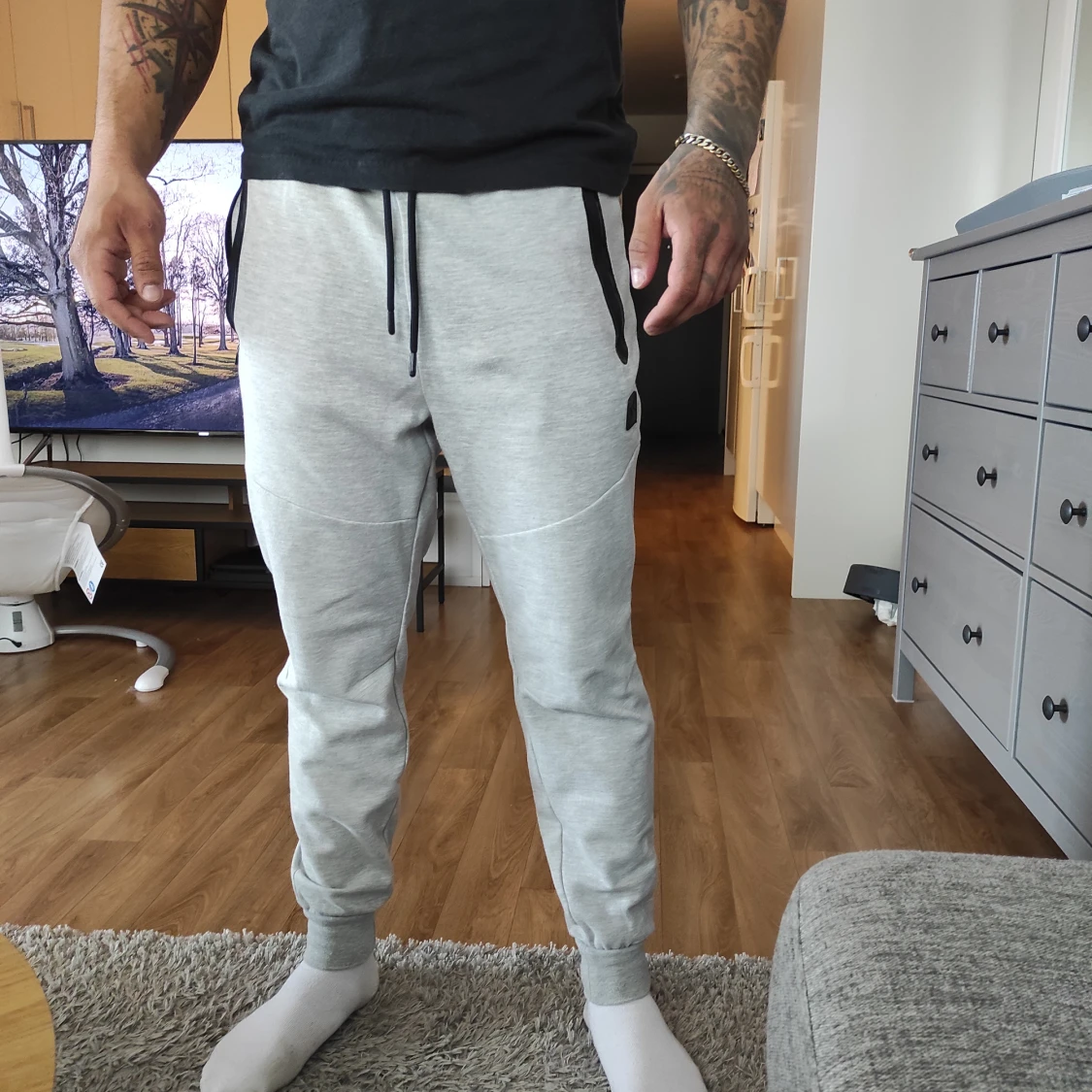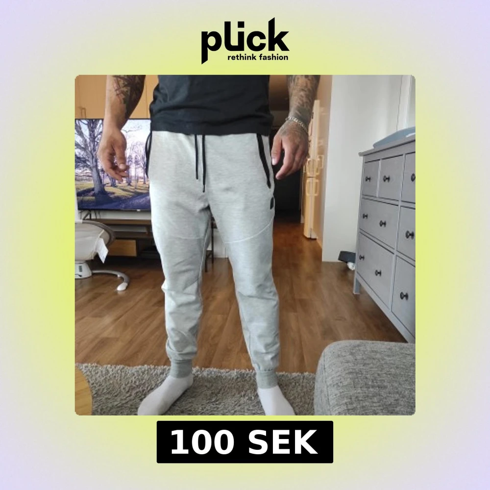 Säljer ett par bekväma grå mjukisbyxor med snörning i midjan. Byxorna har en normal passform och är perfekta för en avslappnad stil. De har svarta detaljer vid fickorna och är tillverkade i ett mjukt material. Från Stadium.