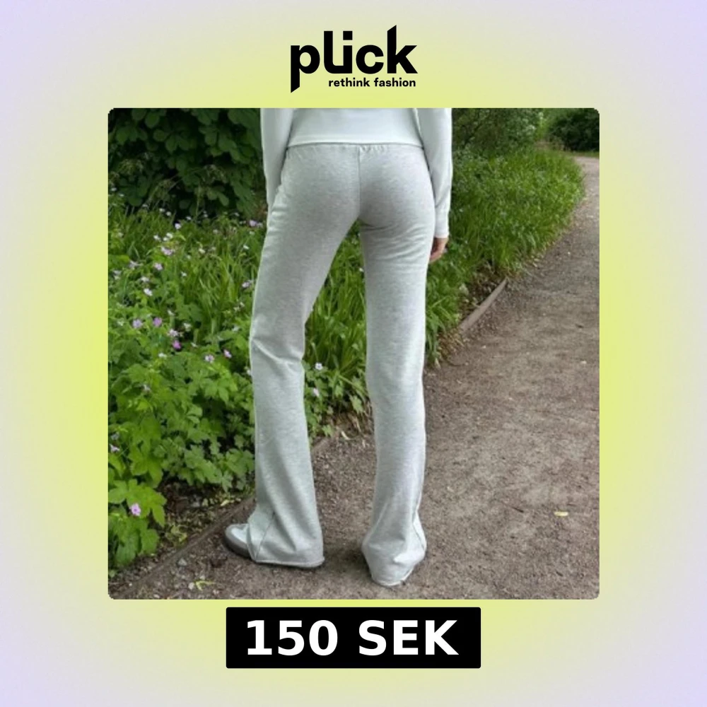 Snygga grå mjukisbyxor med bootcut-stil. De är lågmidjade och har en bekväm passform.❤️