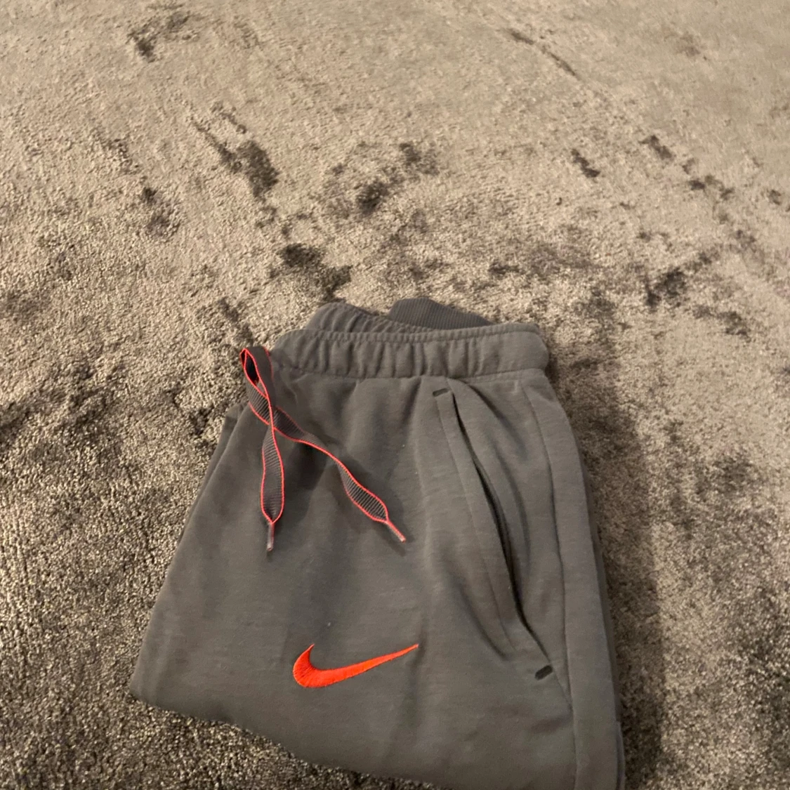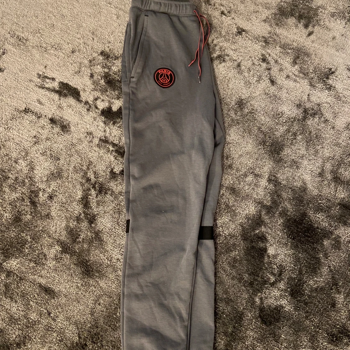 Grå mjukisbyxor från Nike med Paris Saint-Germain-logga och röd Nike Swoosh på framsidan. Byxorna har snörning i midjan, ribbade muddar och svarta banddetaljer på baksidan av benen. Perfekta för chill eller sport.