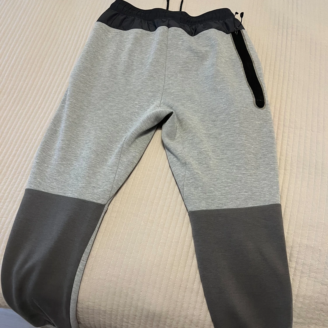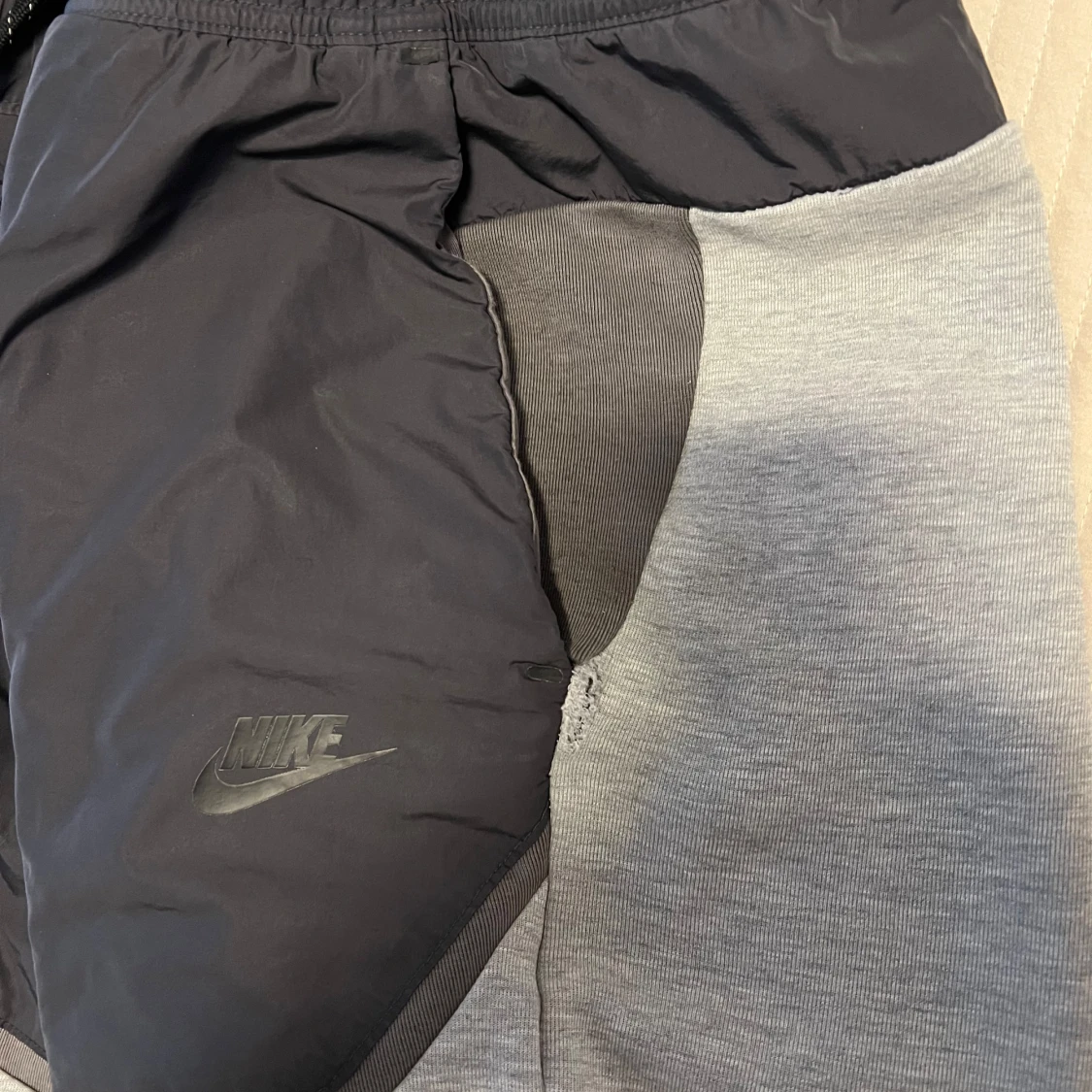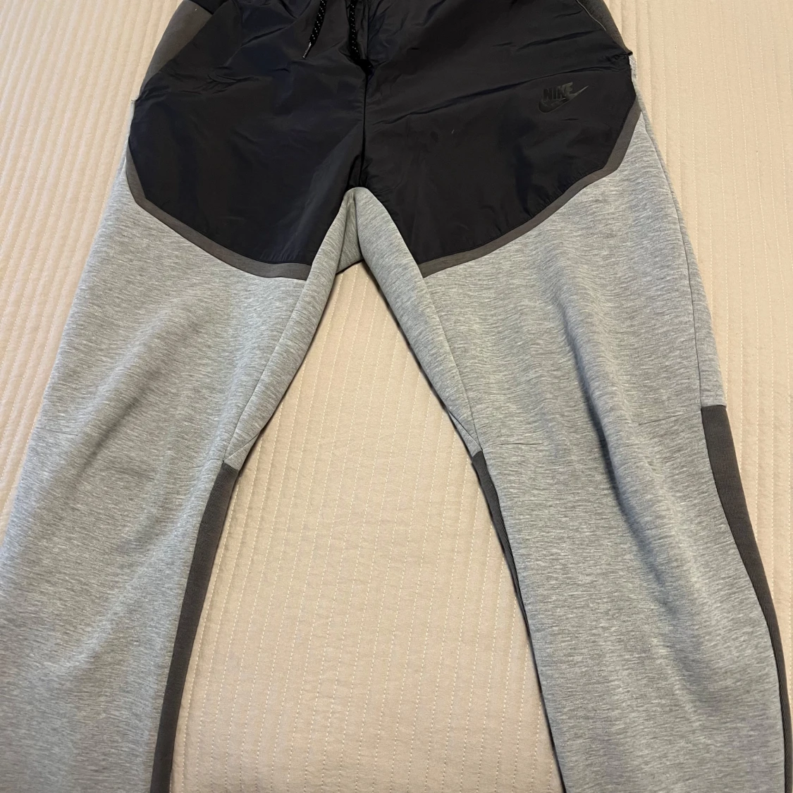Säljer ett par grå och svarta träningsbyxor från Nike. De har en elastisk midja med snörning och dragkedja på sidan. Byxorna är i bra skick förutom lite slitage på sidan
