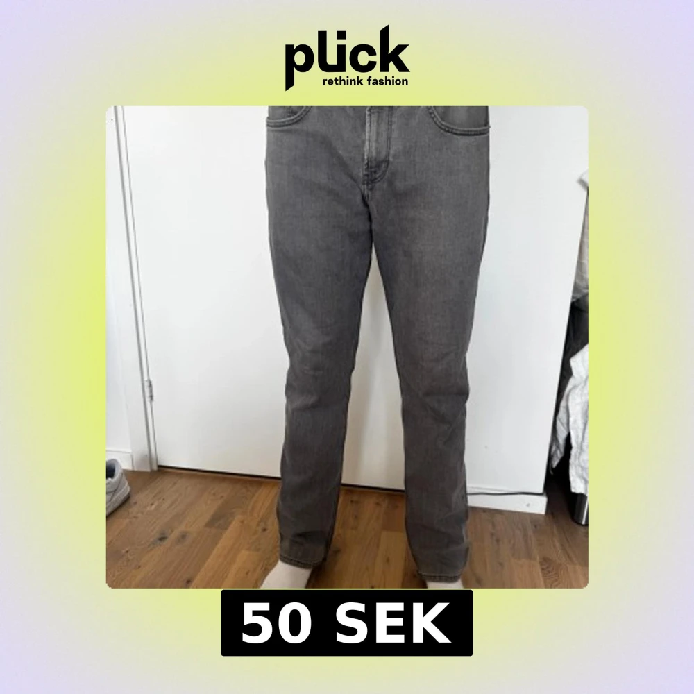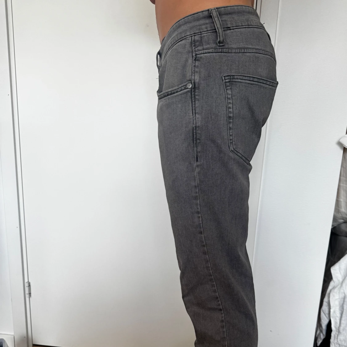 Säljer ett par grå jeans med raka ben och klassisk femficksdesign. Jeansen har normal midja och är tillverkade i mjukt denimtyg. Perfekta för en avslappnad och stilren look.