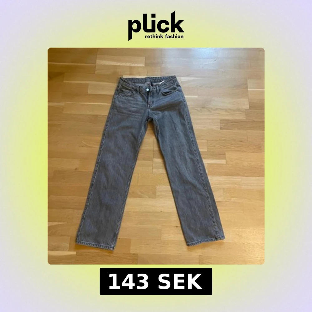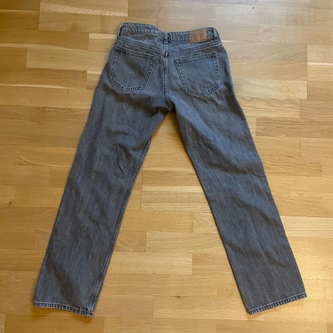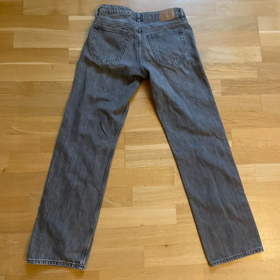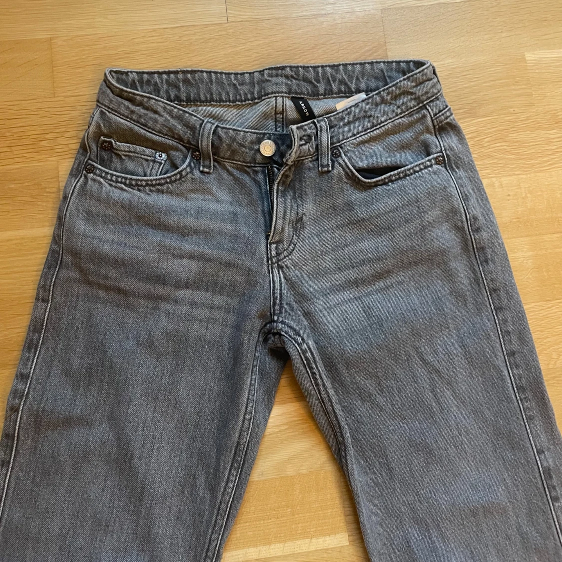 Säljer ett par grå jeans från Weekday med klassisk femficksdesign och raka ben. Jeansen har låg midja och är tillverkade i bomull med en snygg tvättad finish. Perfekta för en clean och avslappnad look.🩵