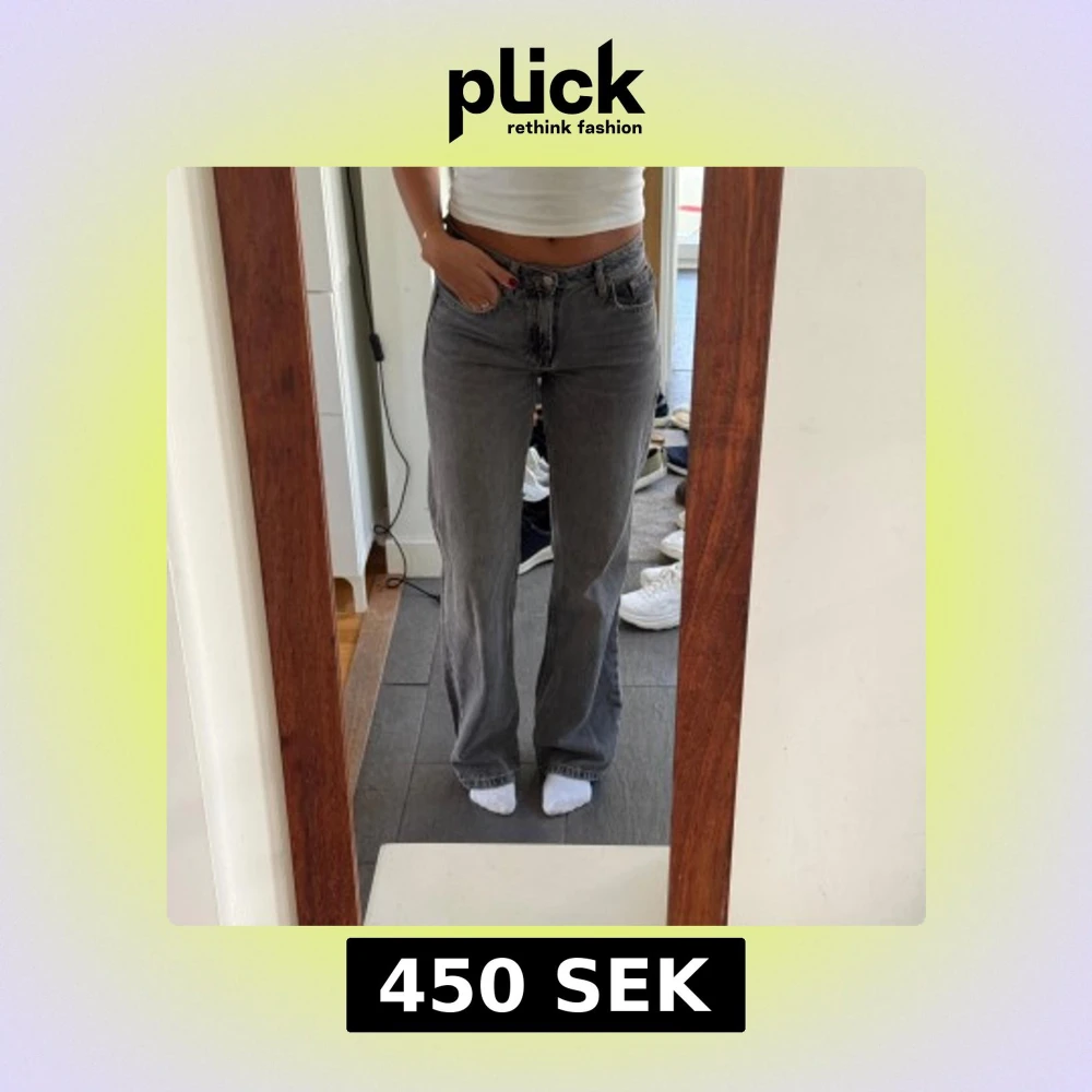 Säljer ett par grå midwaist jeans med klassisk rak passform och hög midja. Jeansen är i denim och har fem fickor, bälteshällor och knappgylf.