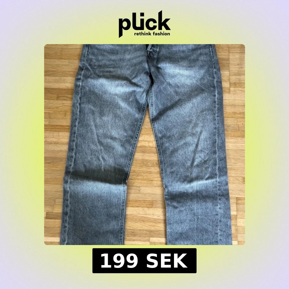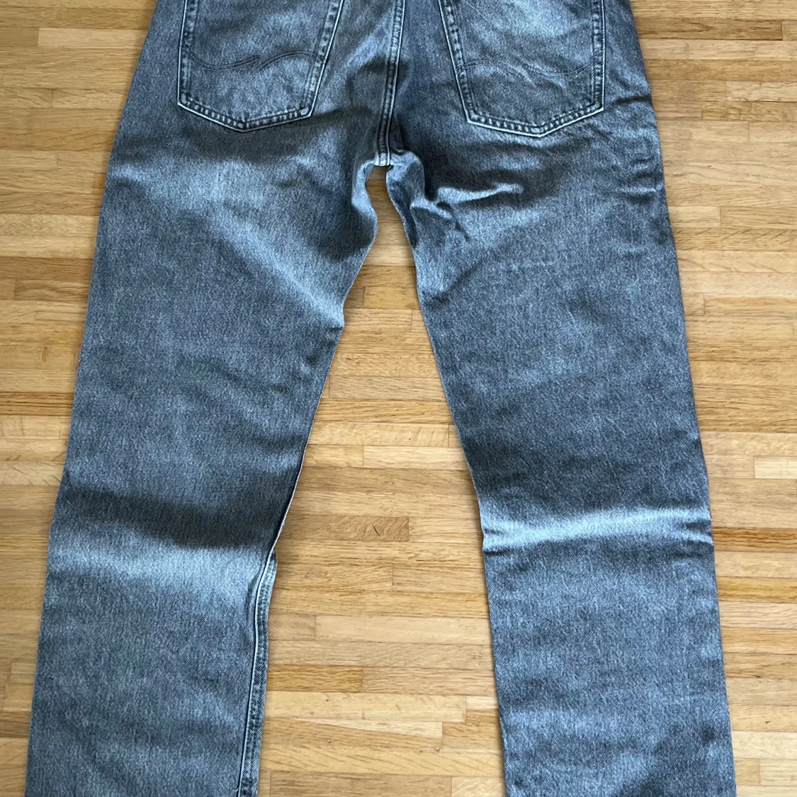 Säljer ett par grå jeans i relaxed fit med raka ben och klassisk femficksdesign. Jeansen har en snygg tvättad look och är tillverkade i slitstarkt denim.