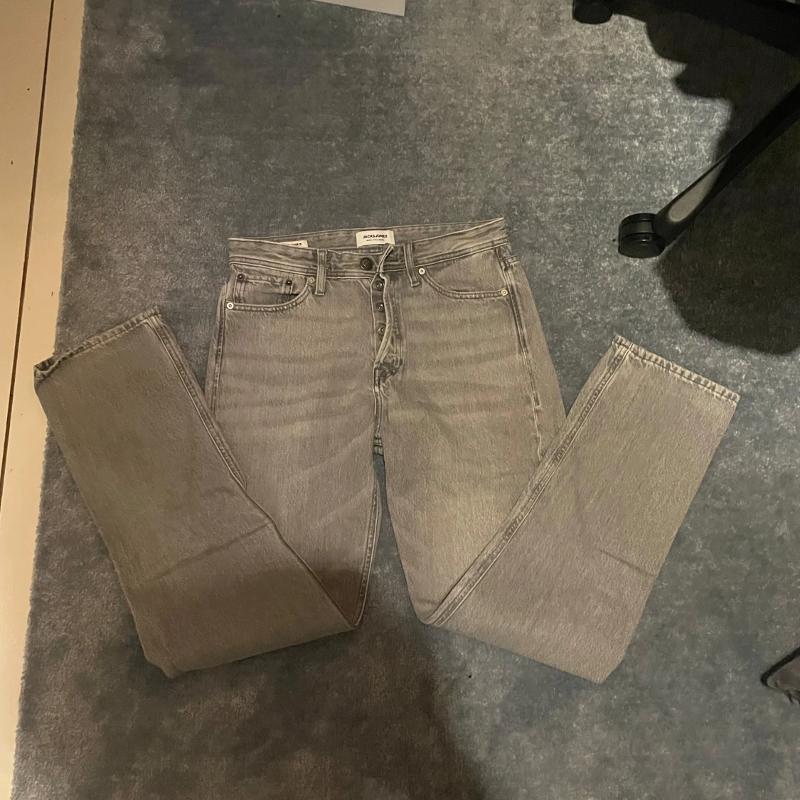 Grå jeans från Jack & Jones i modellen Relaxed/Chris. De har en avslappnad passform med raka ben och klassisk femficksdesign. Jeansen är tillverkade i bomull och har en snygg, ljusgrå tvätt som passar till det mesta.