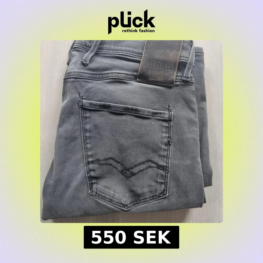 Säljer ett par grå Replay Anbass Hyperflex jeans med klassisk femficksdesign och svarta sömmar på bakfickorna. Jeansen har slim passform och är tillverkade i stretchigt material för extra komfort. Perfekta för dig som gillar stilrena och bekväma jeans. På sista bilden ser man ett litet hål som sitter på vänster ben under knät men det är inget man märker. Priset e ej hugget I sten och om du har mer frågor så tveka inte att skriva.