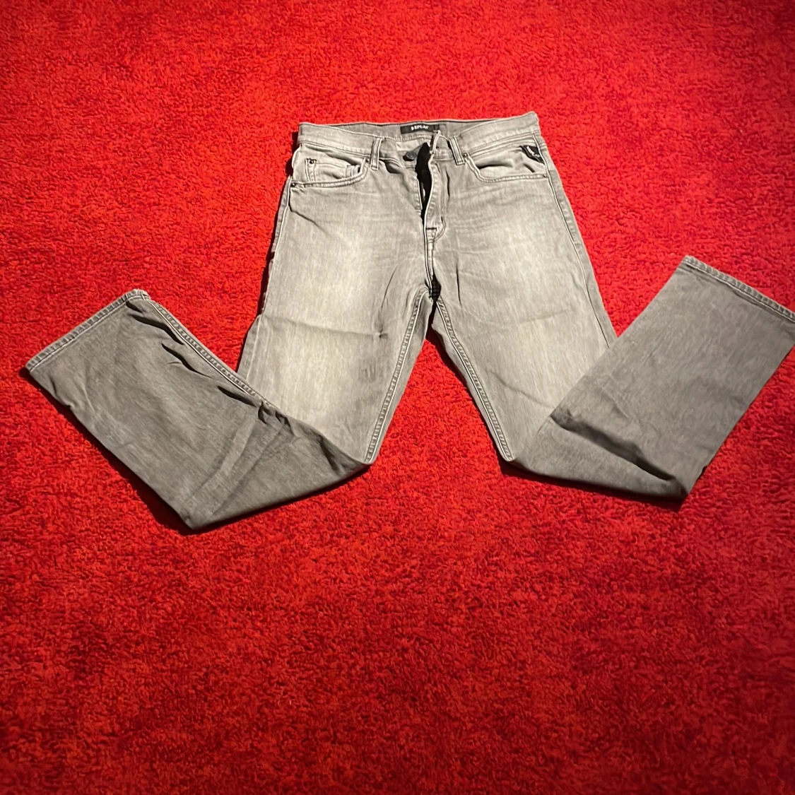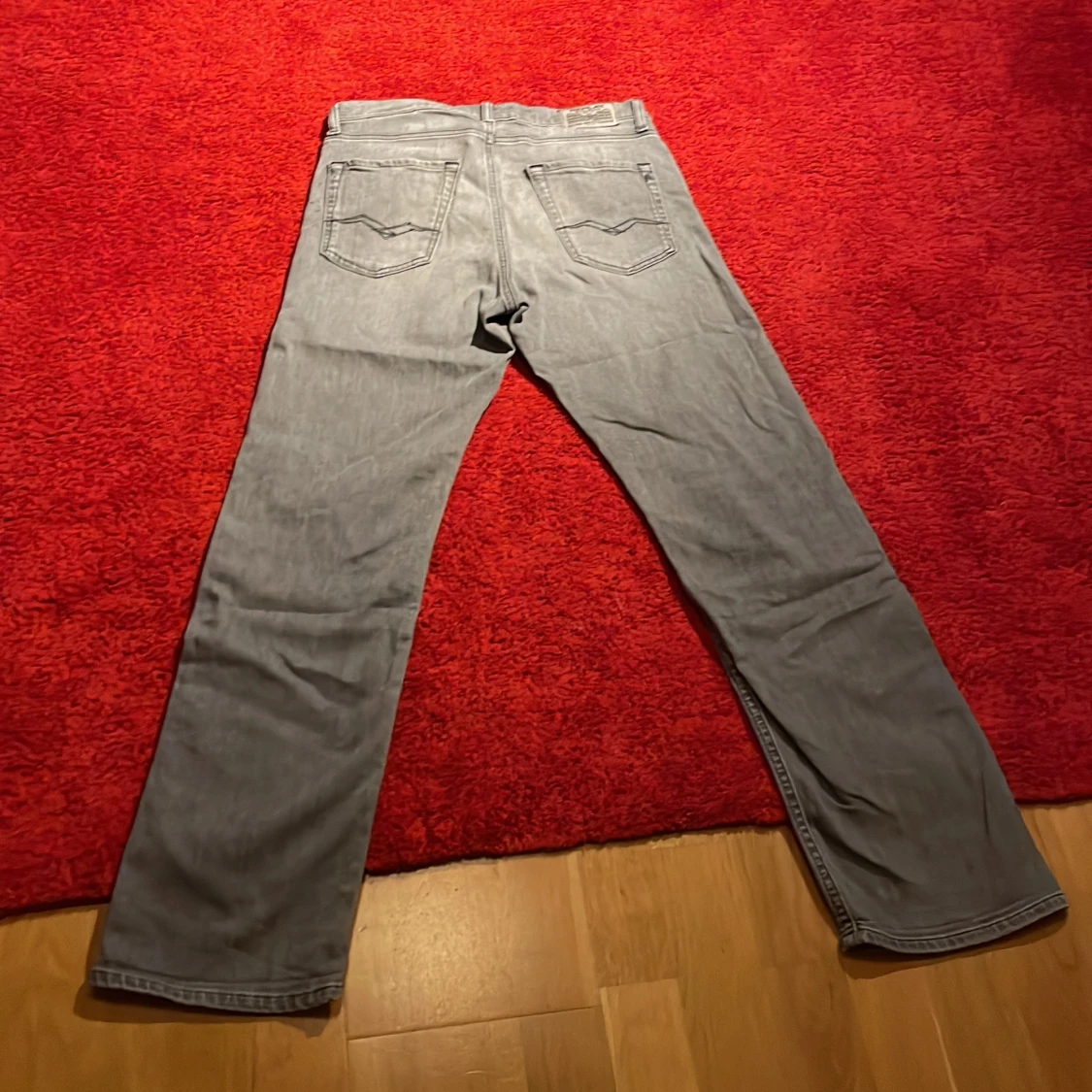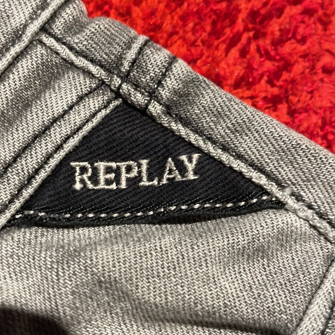 Säljer ett par gråa Replay Thad jeans med klassisk femficksdesign och raka ben. Jeansen har snyggt tvättad look och diskreta sömmar på bakfickorna. Perfekta för dig som gillar en enkel och stilren vibe. Materialet är mjukt jeans-tyg.