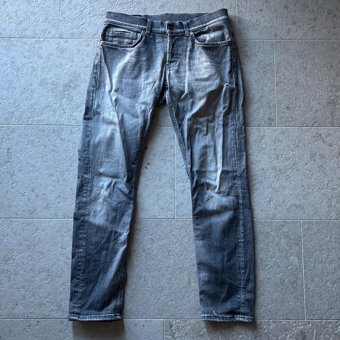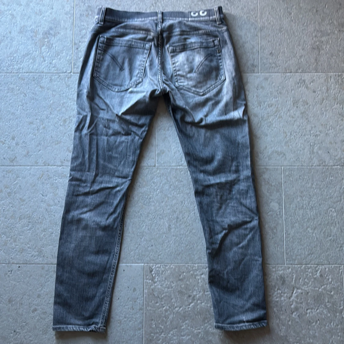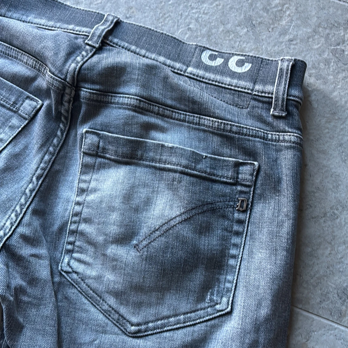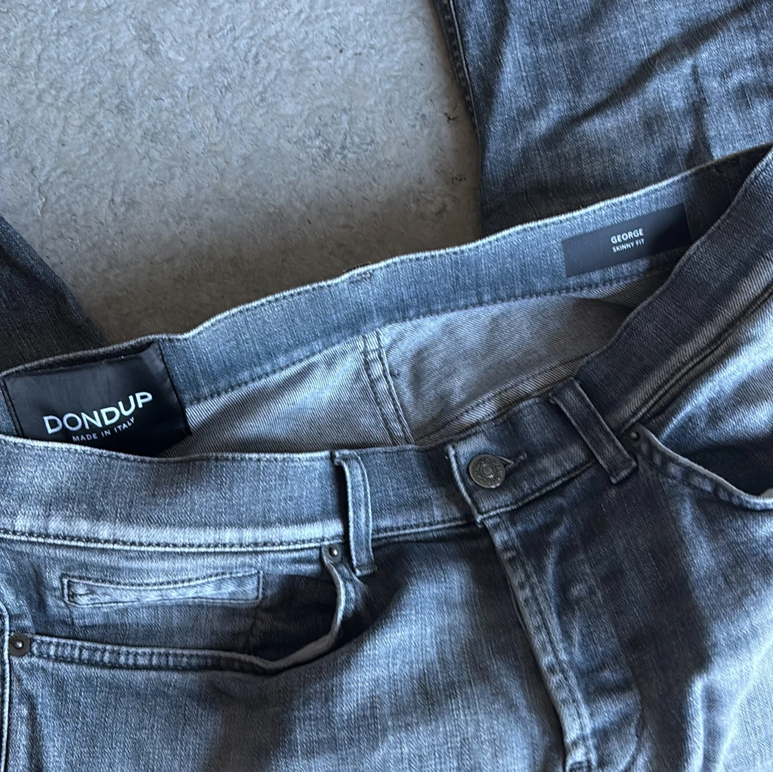 Säljer ett par grå skinny jeans från Dondup, modell George. Jeansen har en snygg tvättad look, klassiska fem fickor och diskret logga bak på linningen. Tillverkade i mjukt denimtyg med smal passform och normal midja.