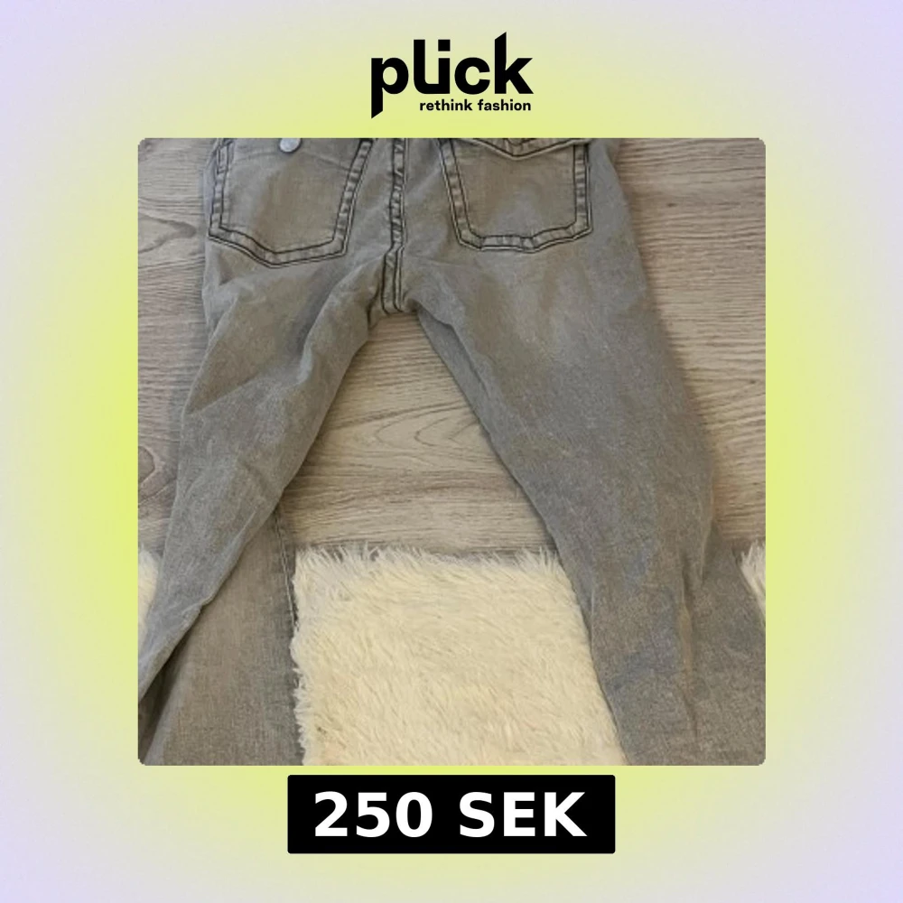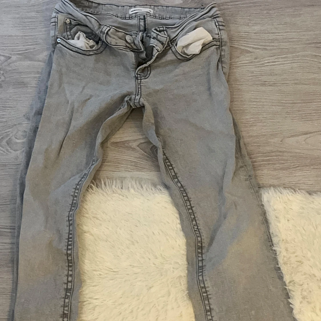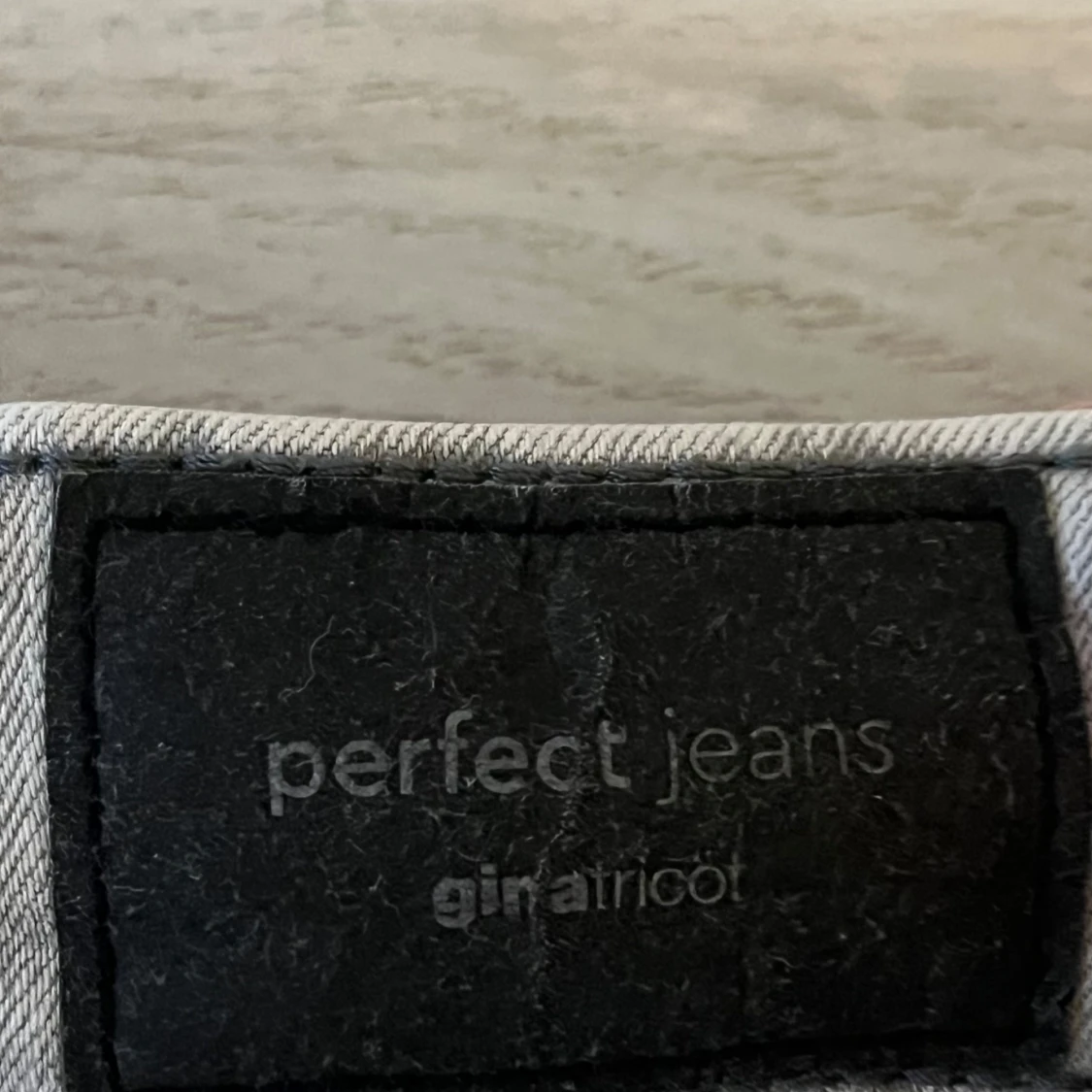 Säljer ett par grå flared jeans från Gina Tricot, modellen Perfect Jeans. De har klassiska fem fickor, smal passform och snygga kontrastsömmar. Perfekt för dig som gillar en enkel och stilren look med lite edge.