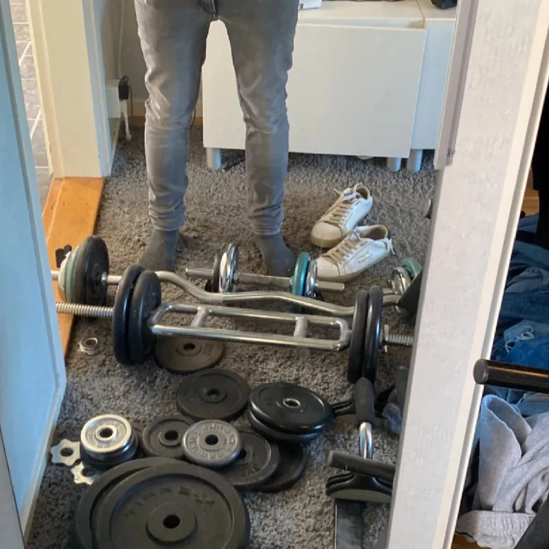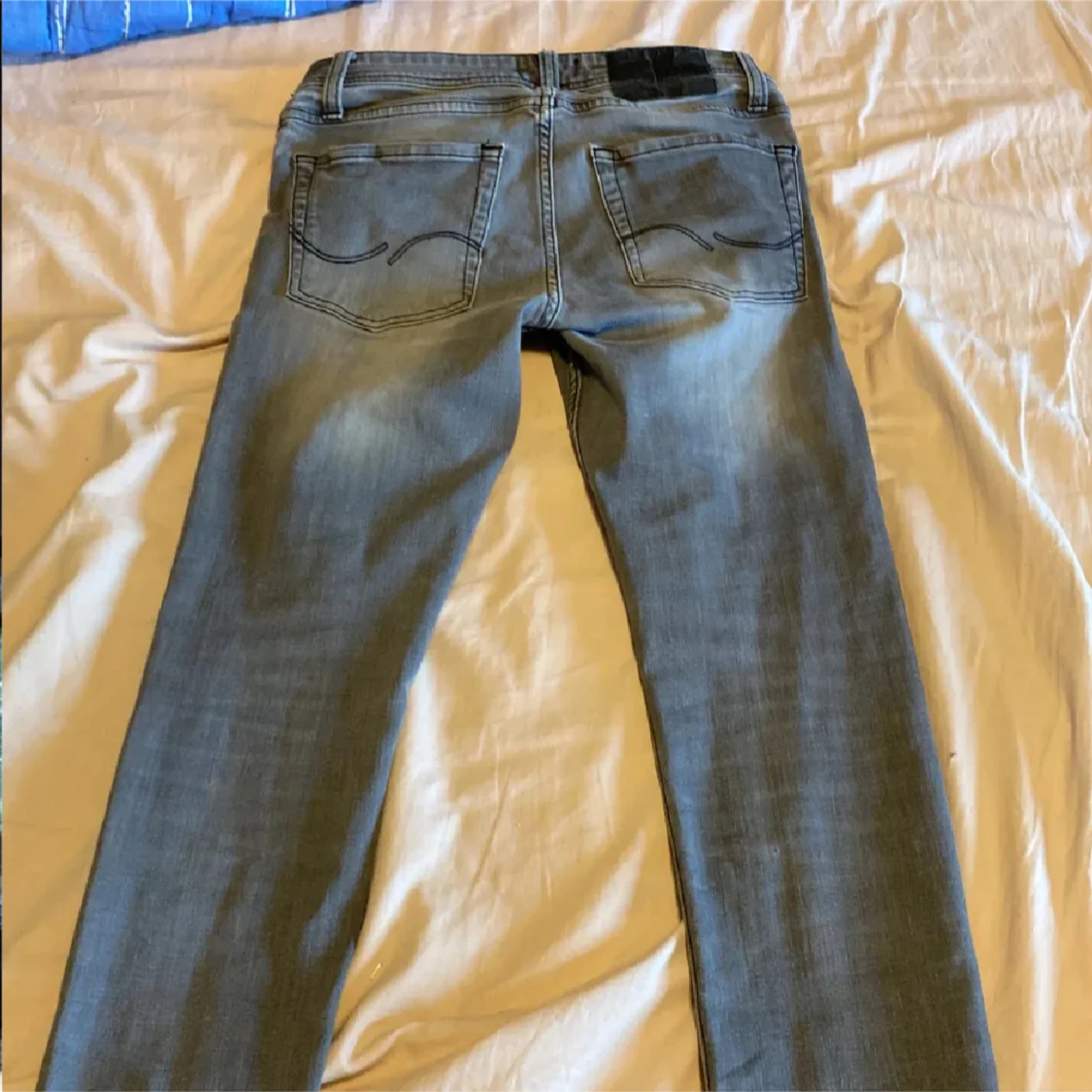 Säljer ett par grå skinny jeans med snygg ljus tvätt och klassiska bakfickor. Jeansen har smal passform och sitter tajt längs benen. Perfekta för dig som gillar en modern och stilren look. Materialet är stretchigt jeans för extra komfort.