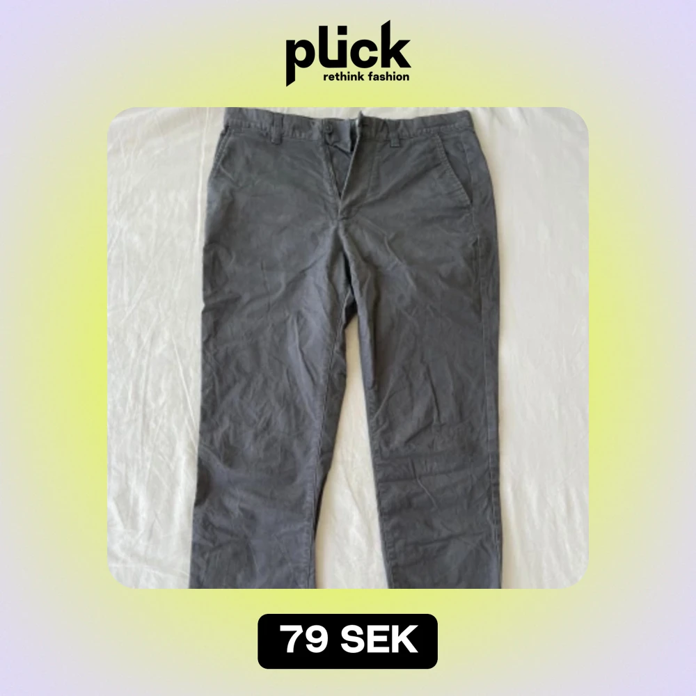 Säljer ett par grå slim fit byxor från H&M i storlek 30/32. Byxorna är i bra skick och har en klassisk design med dragkedja och knappar. Perfekta för både vardag och fest! Frågor? Skriv!