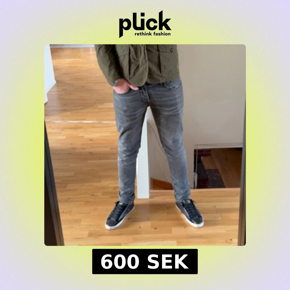 Säljer ett par grå slim fit jeans från dondup i storlek 34. Jeansen har en snygg slitning vid fickan, klassisk femficksdesign och en tvättad look. Perfekta för dig som gillar en smalare passform och vill ha ett par stilrena jeans med lite edge.