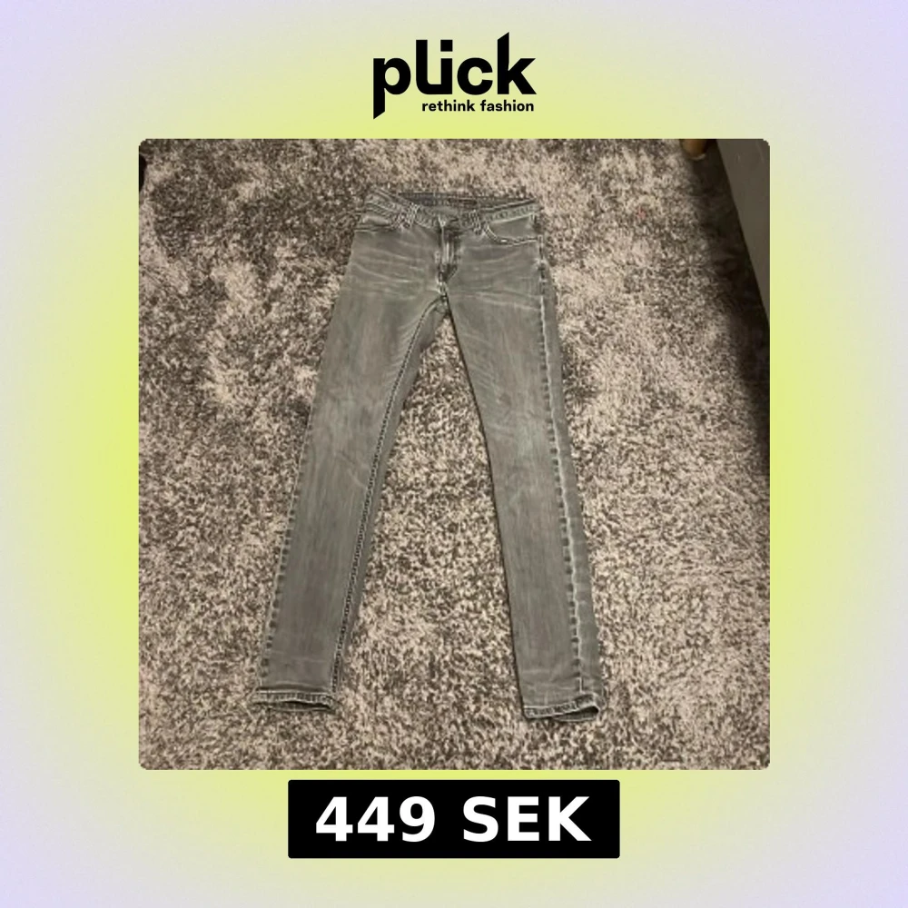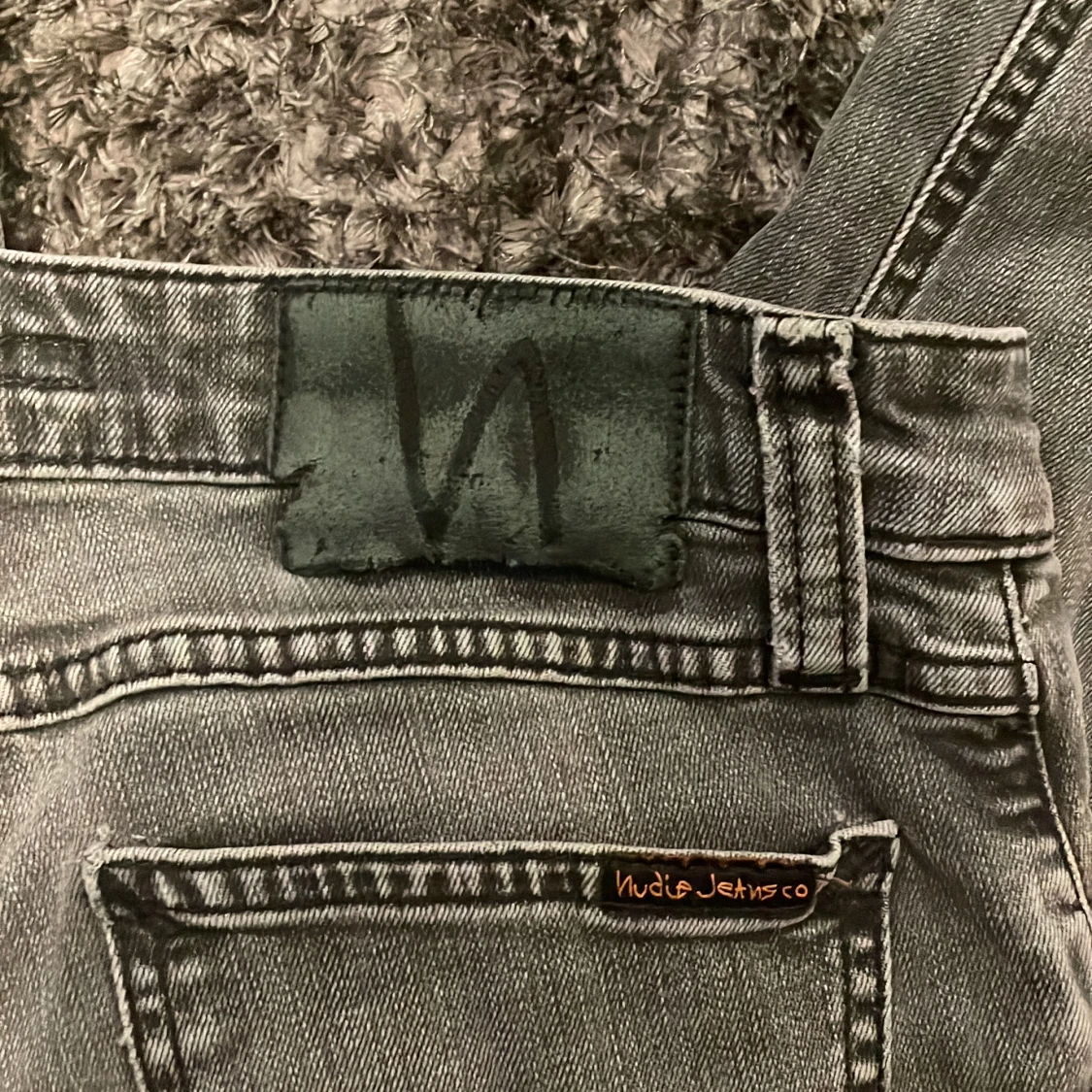 Säljer ett par grå slim jeans från Nudie Jeans med slitna detaljer och klassisk femficksdesign. Jeansen har en smal passform och är tillverkade i mjukt denimtyg. Snygga kontrastsömmar och svart logopatch baktill ger extra edge.