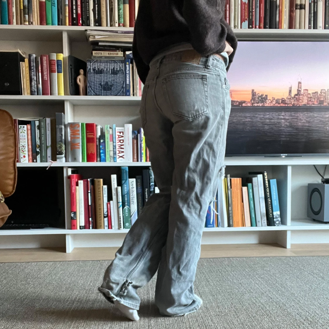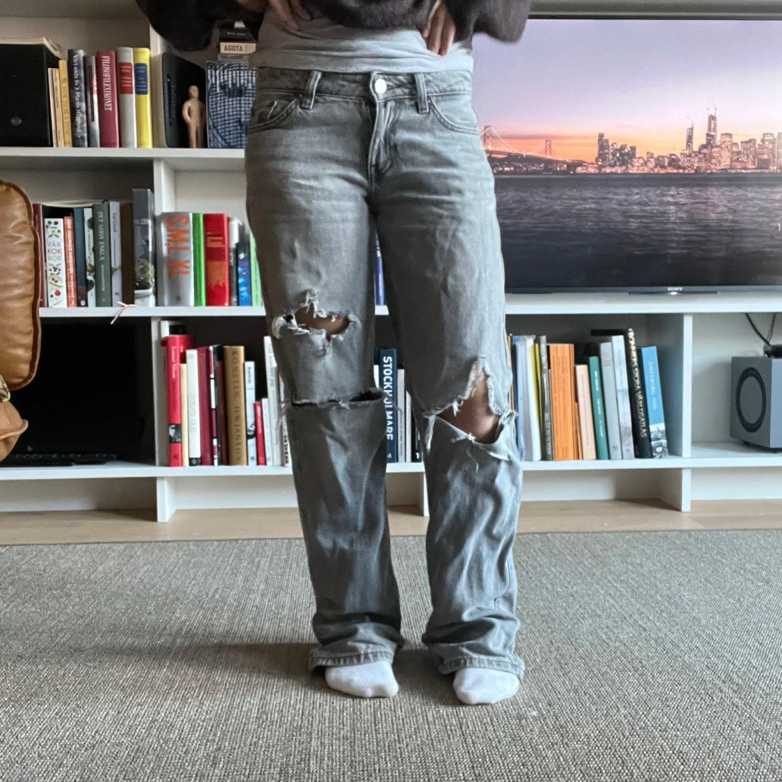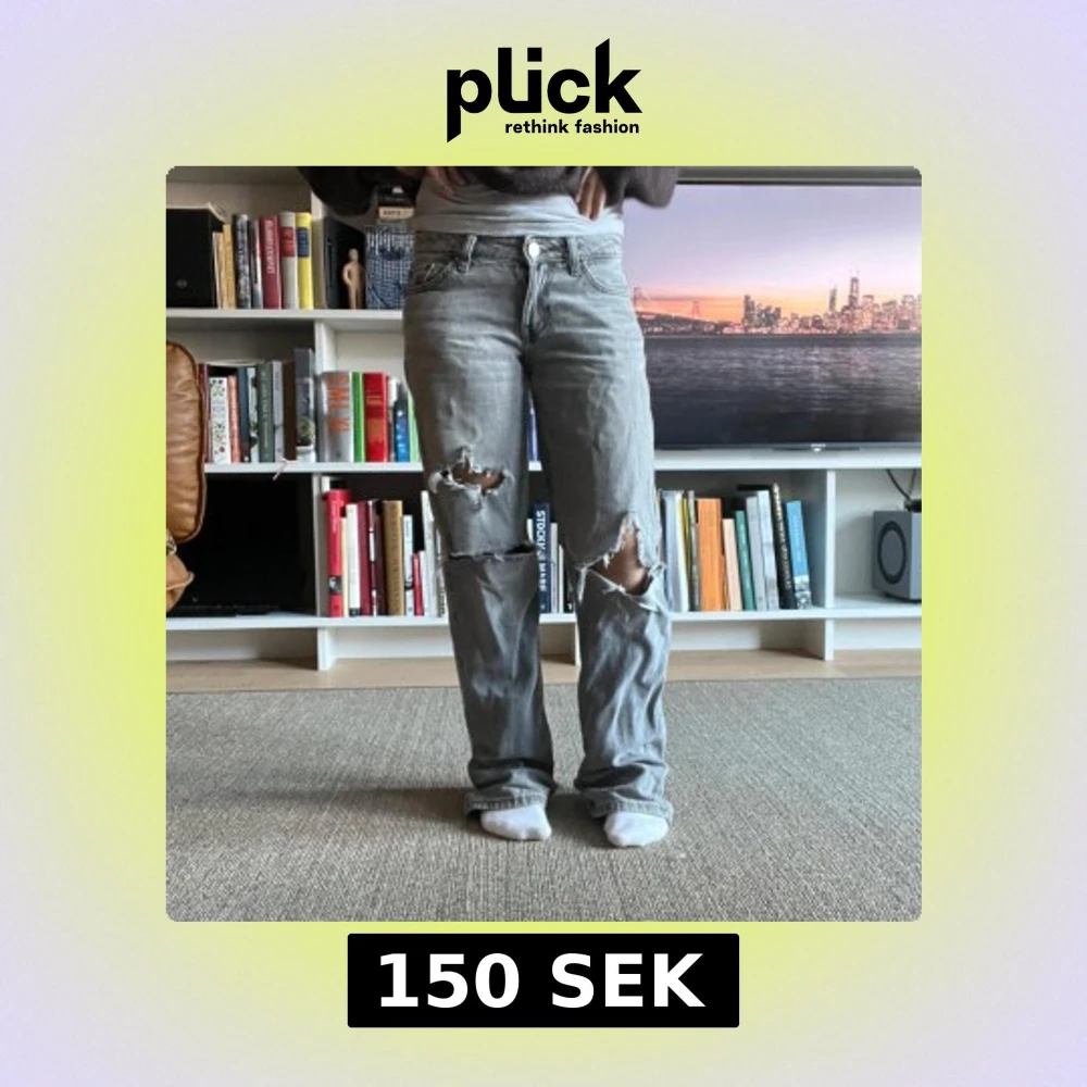 Grå baggy jeans med slitningar. Klassisk femficksmodell med låg midja och avslappnad passform. Perfekta för en avslappnad och edgy stil.