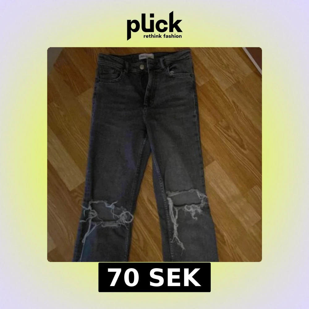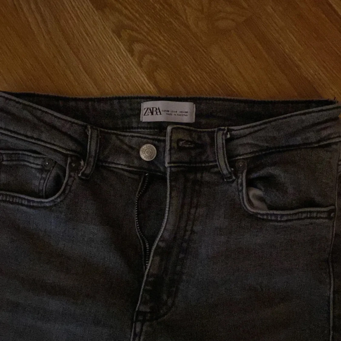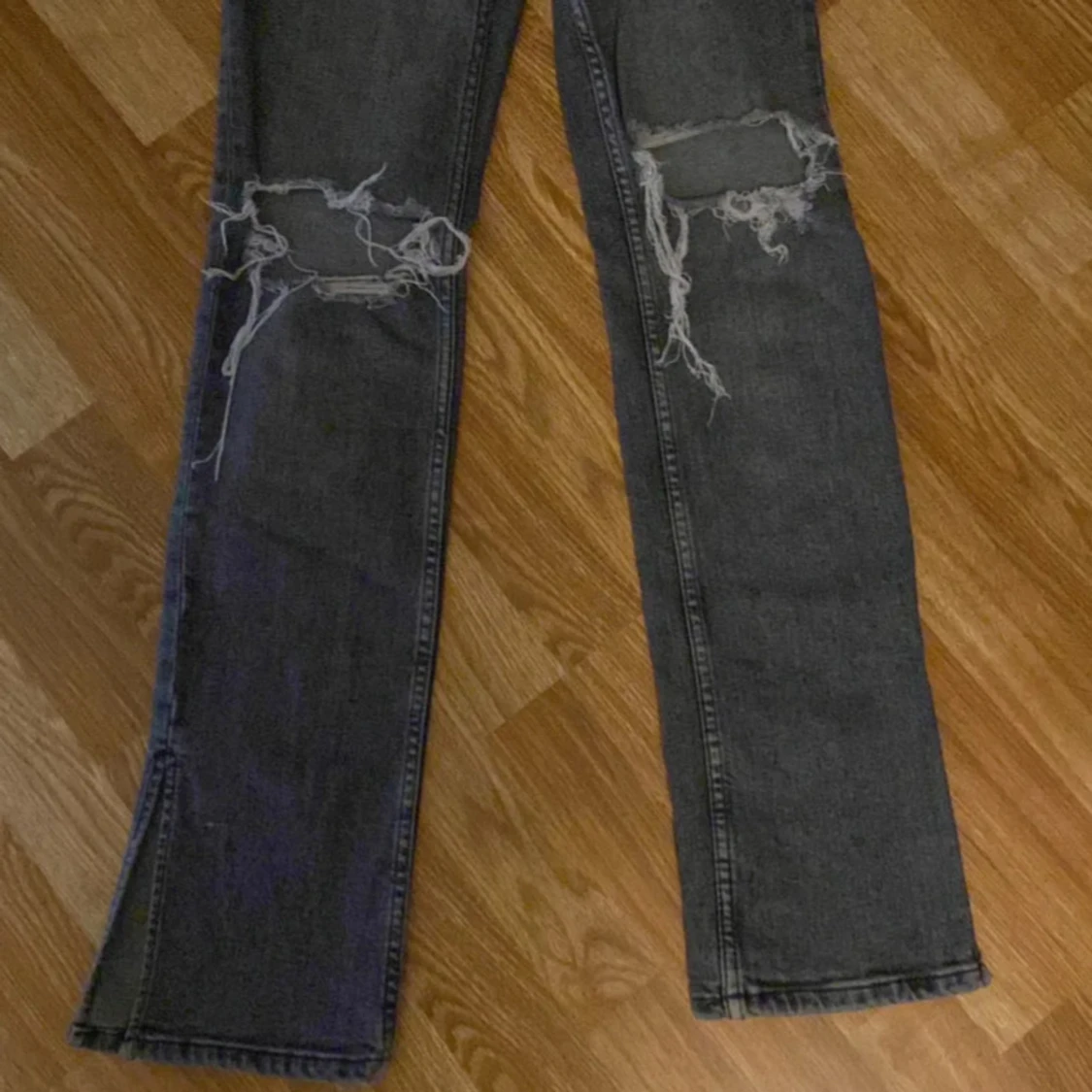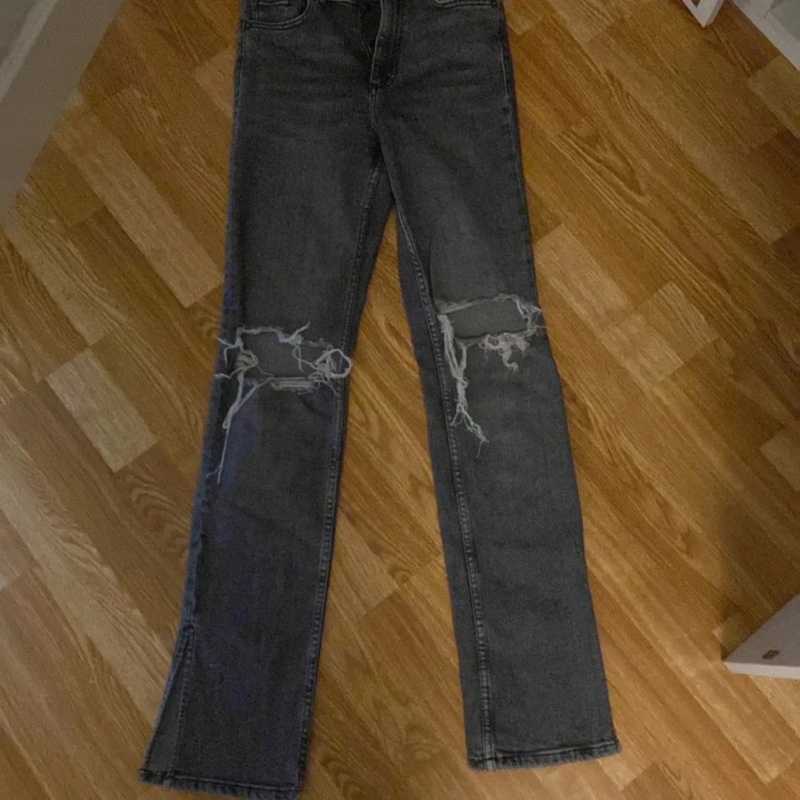Säljer ett par grå jeans från Zara med raka ben och stora slitningar över båda knäna
