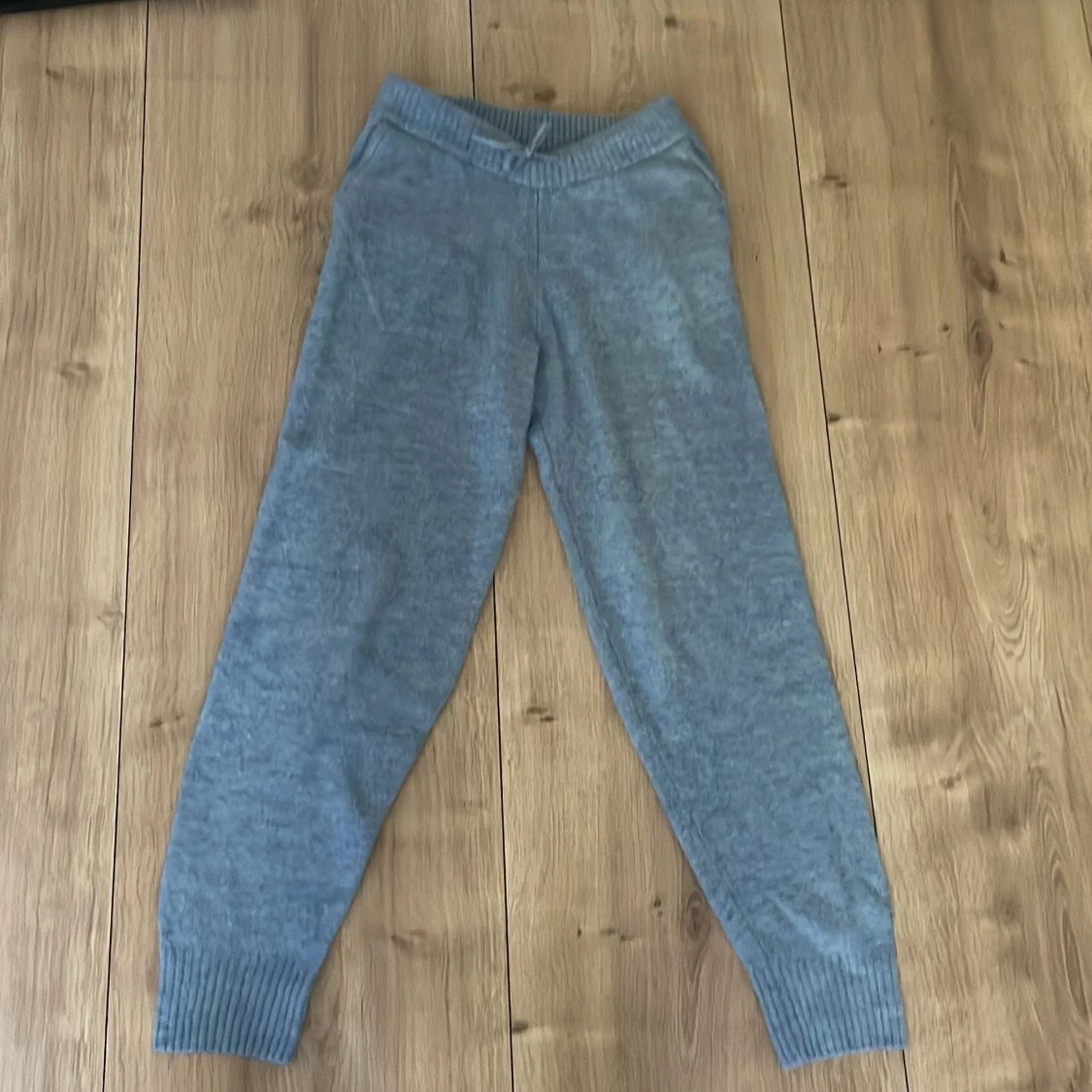 Mysiga grå stickade mjukisbyxor från Lindex Kids. Byxorna har bred resår i midjan och vid bensluten för extra komfort. Perfekta för chill dagar hemma eller när du vill vara extra bekväm.