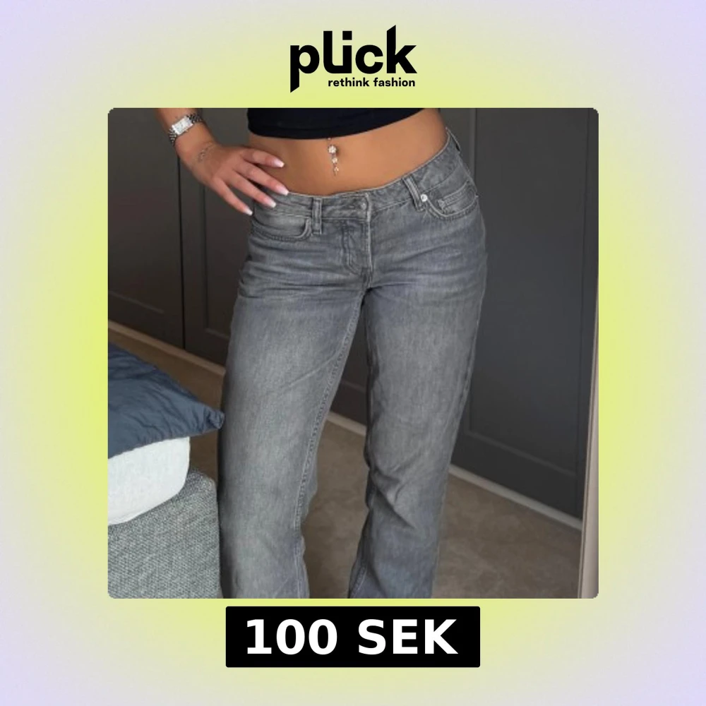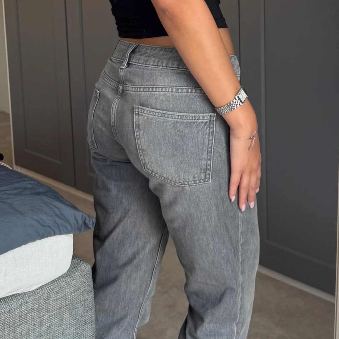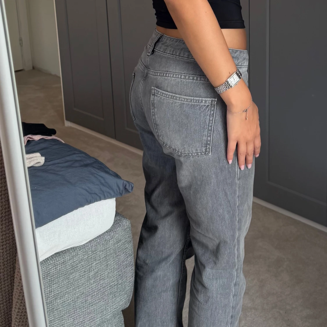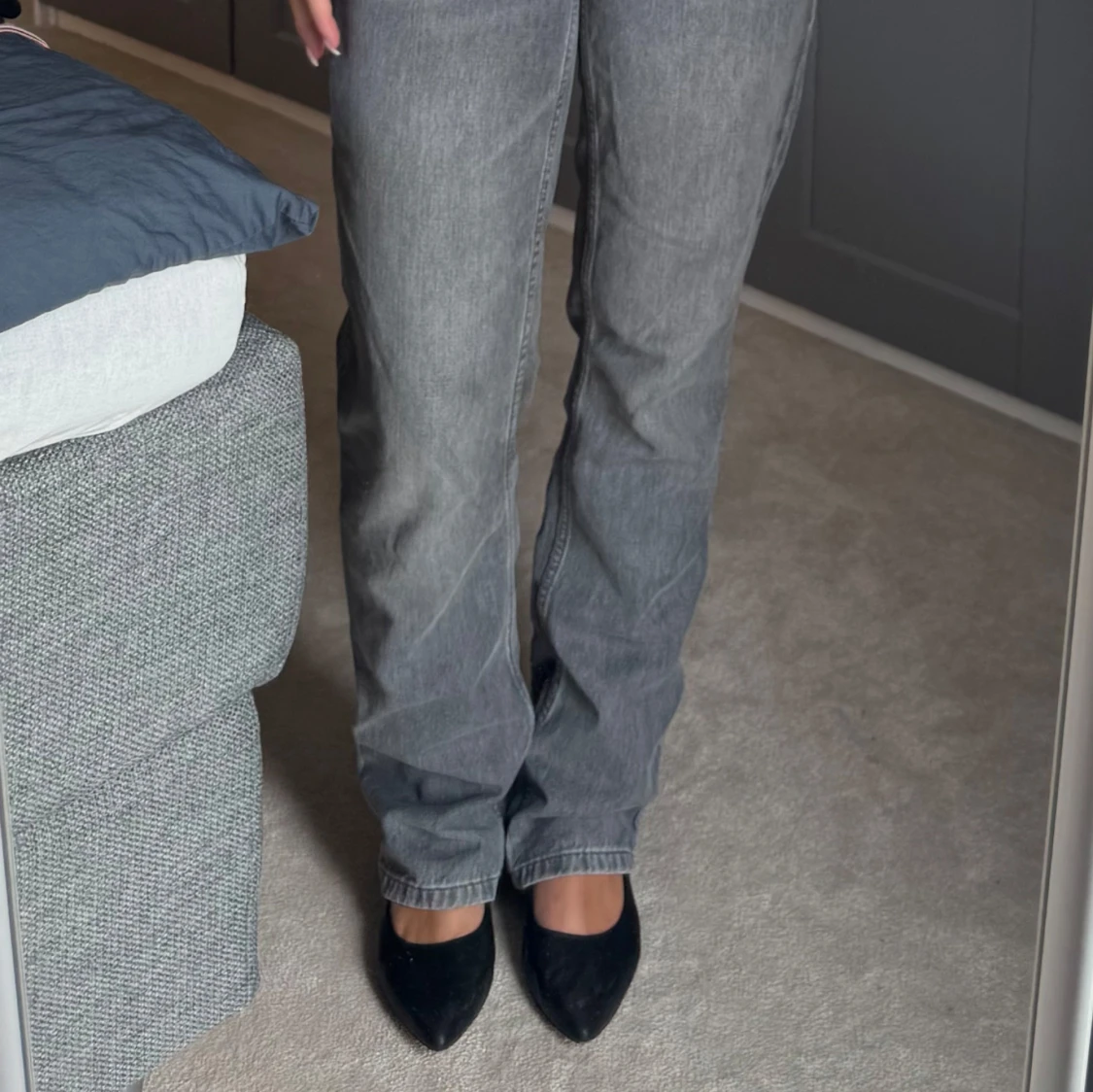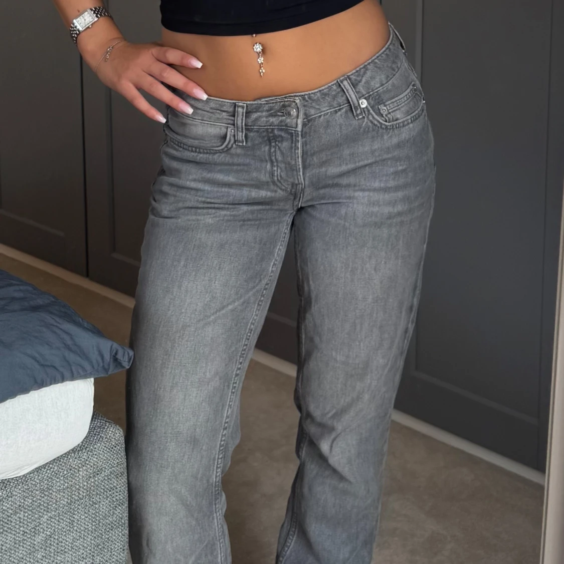 Säljer ett par gråa jeans med klassisk raka ben. Jeansen har låg midja och är tillverkade i mjukt denimtyg som ger en chill vibe. Perfekt för dig som gillar en enkel och clean look.