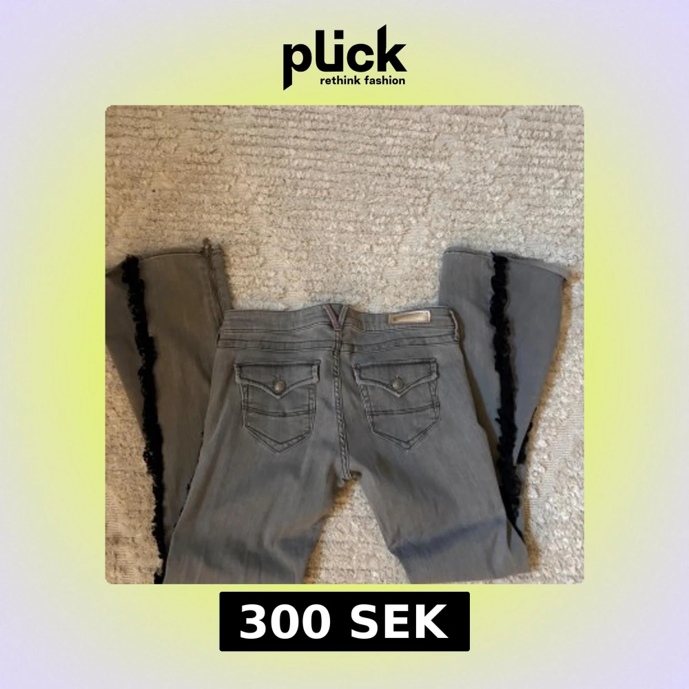 Snygga grå jeans från Super Soin i bootcut passform och superlow midja. Byxorna har svarta volangdetaljer längs utsidan av benen och dragkedjor vid bensluten. Perfekta för dig som vill sticka ut med en unik look., sitter som en m