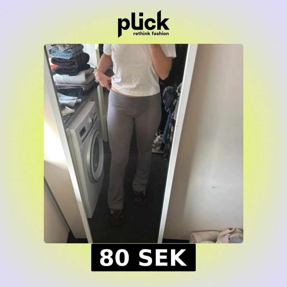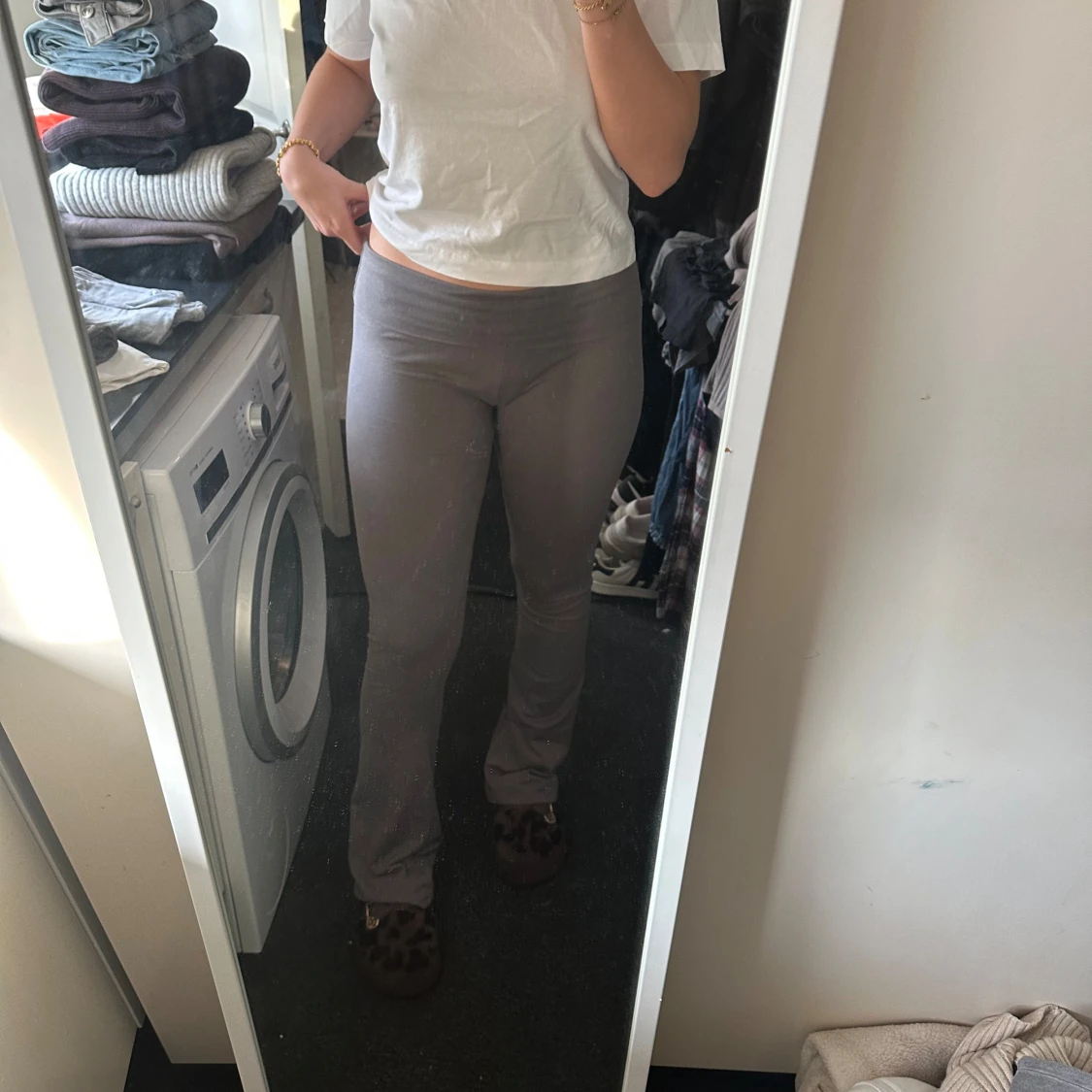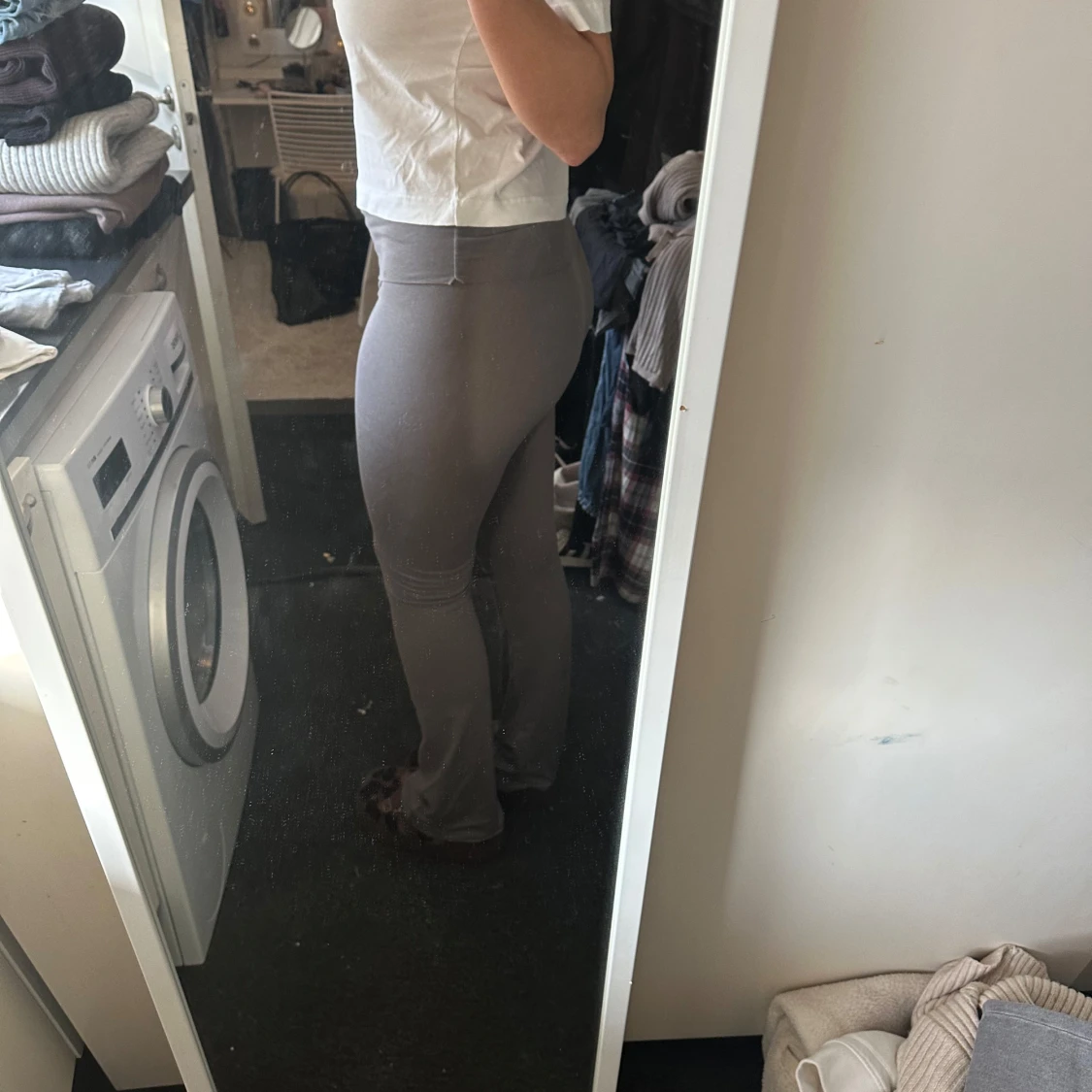 Säljer ett par grå leggings med tight passform och hög midja. Byxorna är enkla och stilrena utan synliga detaljer, perfekta för en avslappnad look.