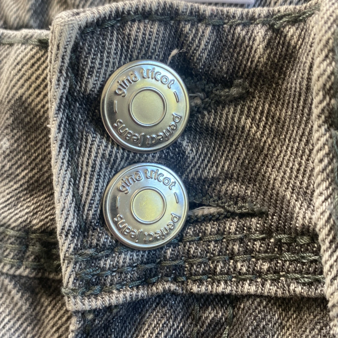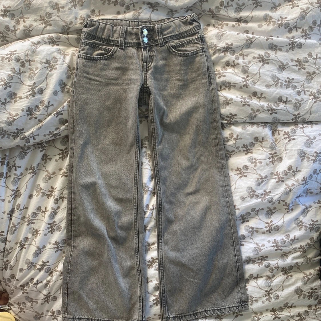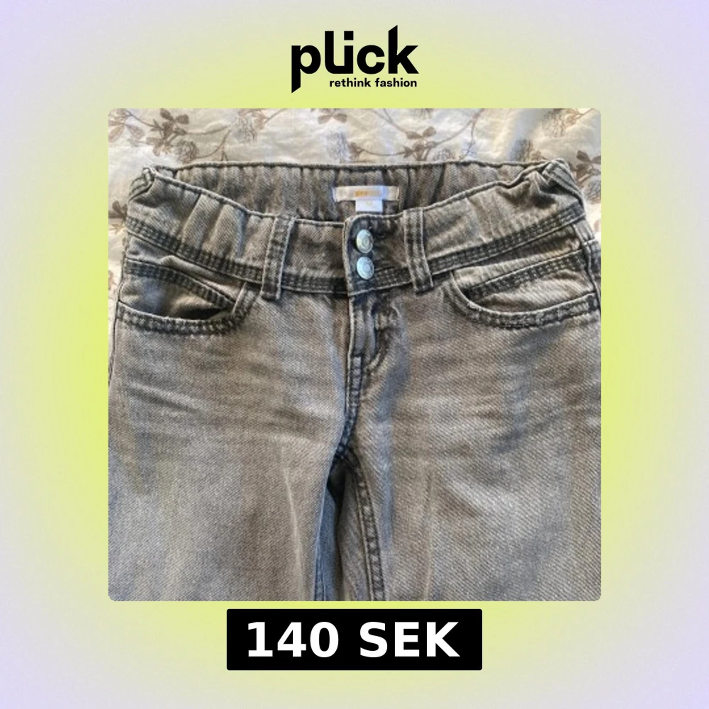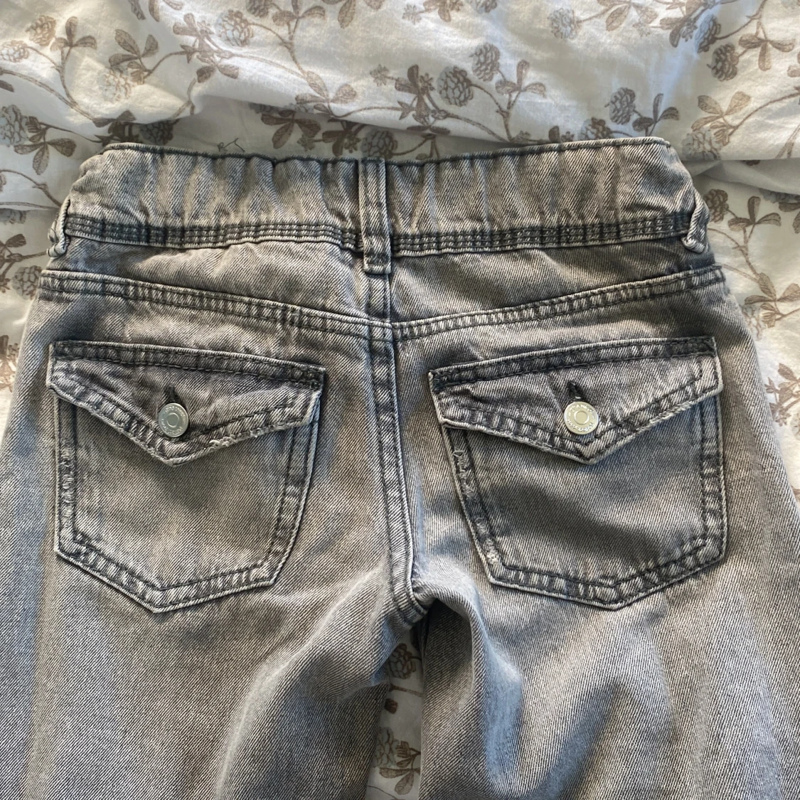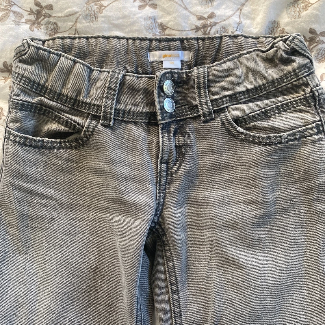 Snygga grå jeans från Gina Tricot med två y2k knappar där bak. Modellen är wide med raka ben. Perfekt för dig som gillar trendig stil.