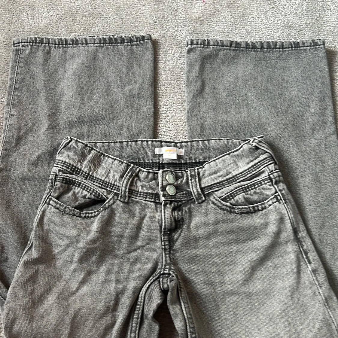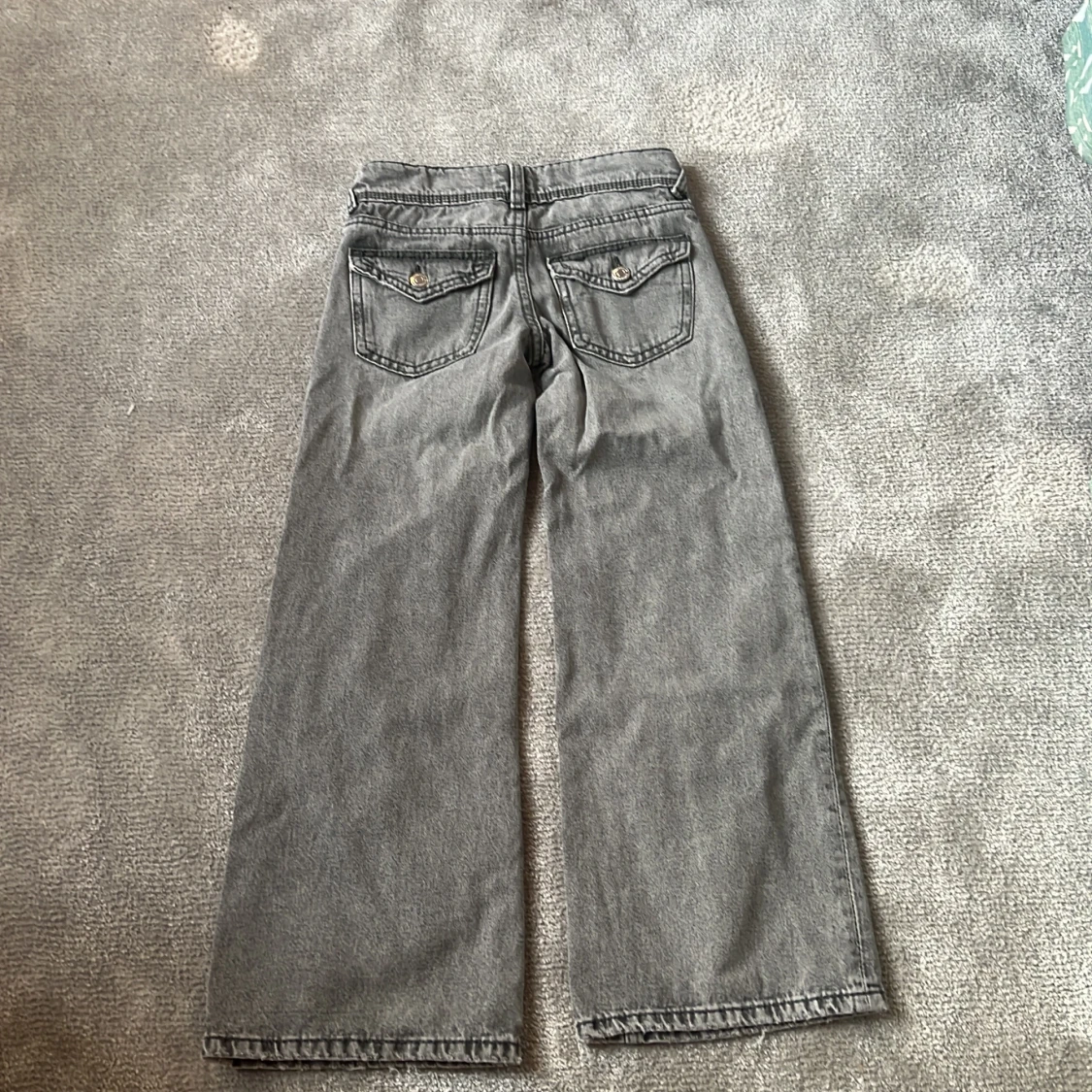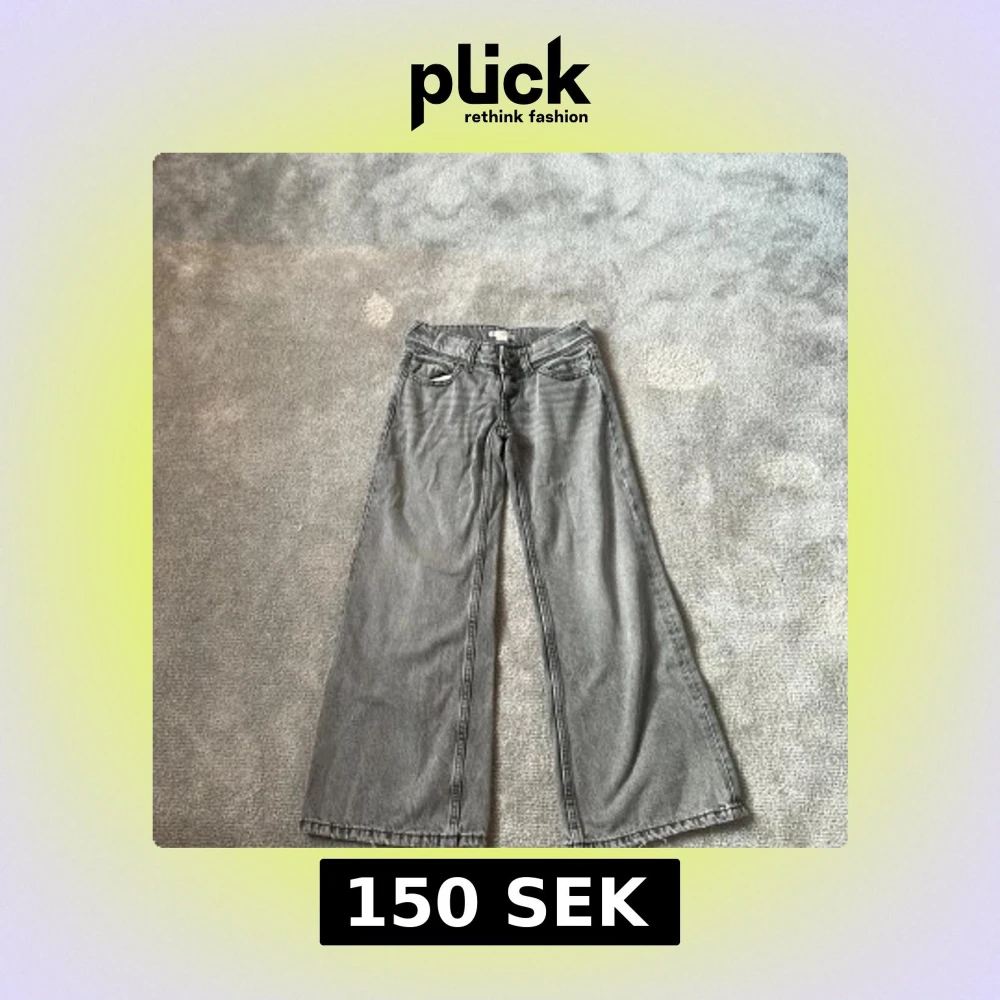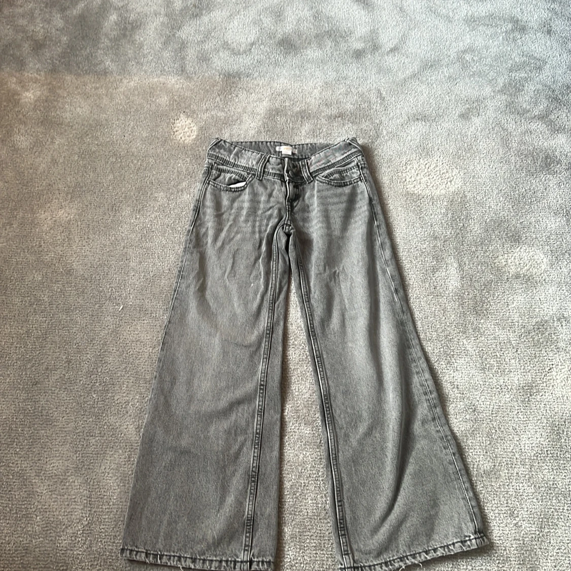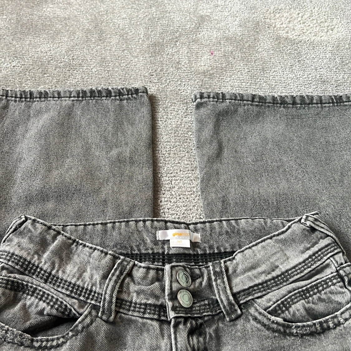 Säljer ett par grå jeans från Gina Tricot i storlek 140. Byxorna har breda ben och klassisk femficksdesign med knapp och dragkedja framtill. Perfekta för dig som gillar en avslappnad och trendig stil.